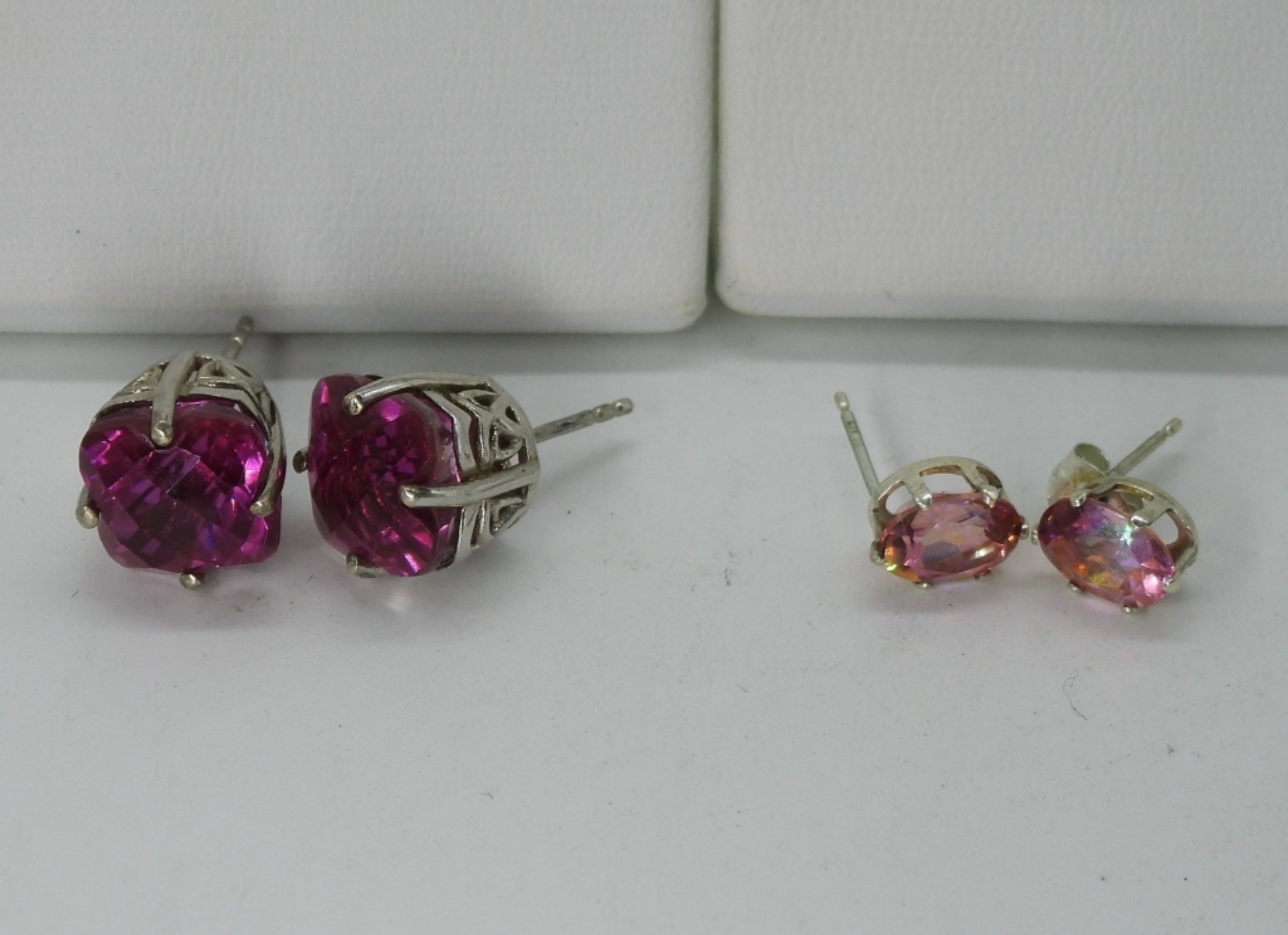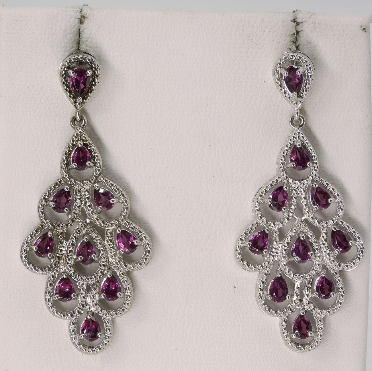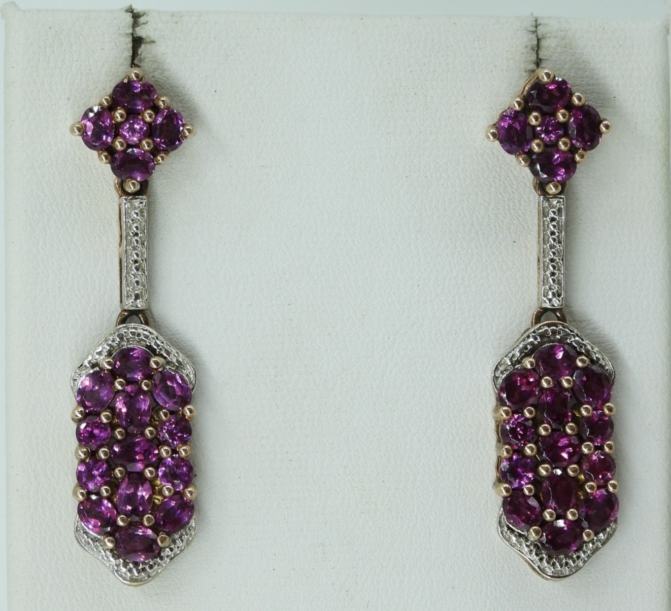 Two pair of rhodolite garnet dangling pierced earrings, 2″ long. Two other pair of pierced earrings. (15.7 dwt)