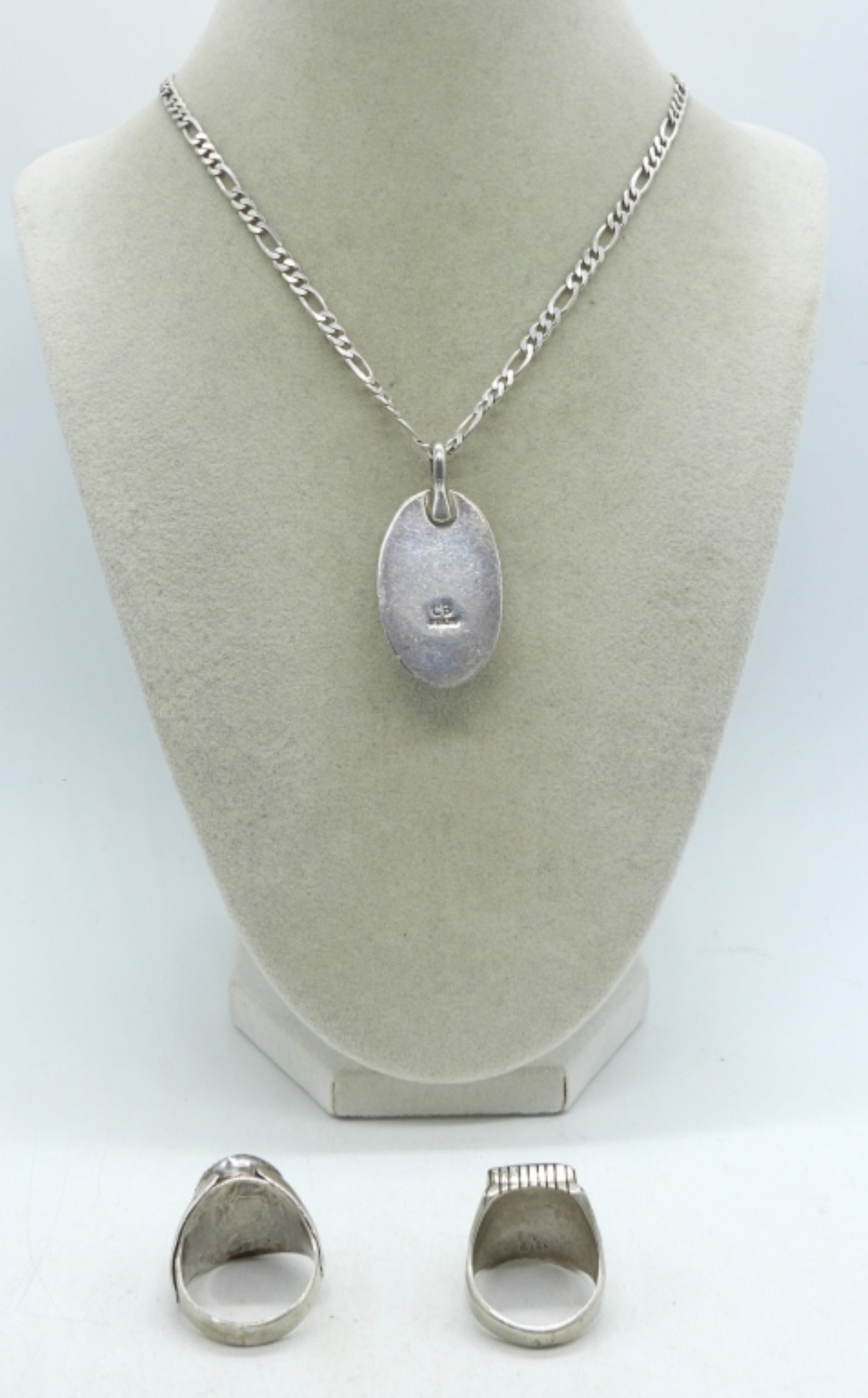 Two men’s sterling rings, sizes 10 & 11. Sterling black onyx pendant, 2″ on a sterling 24″ chain. (36 dwt)
