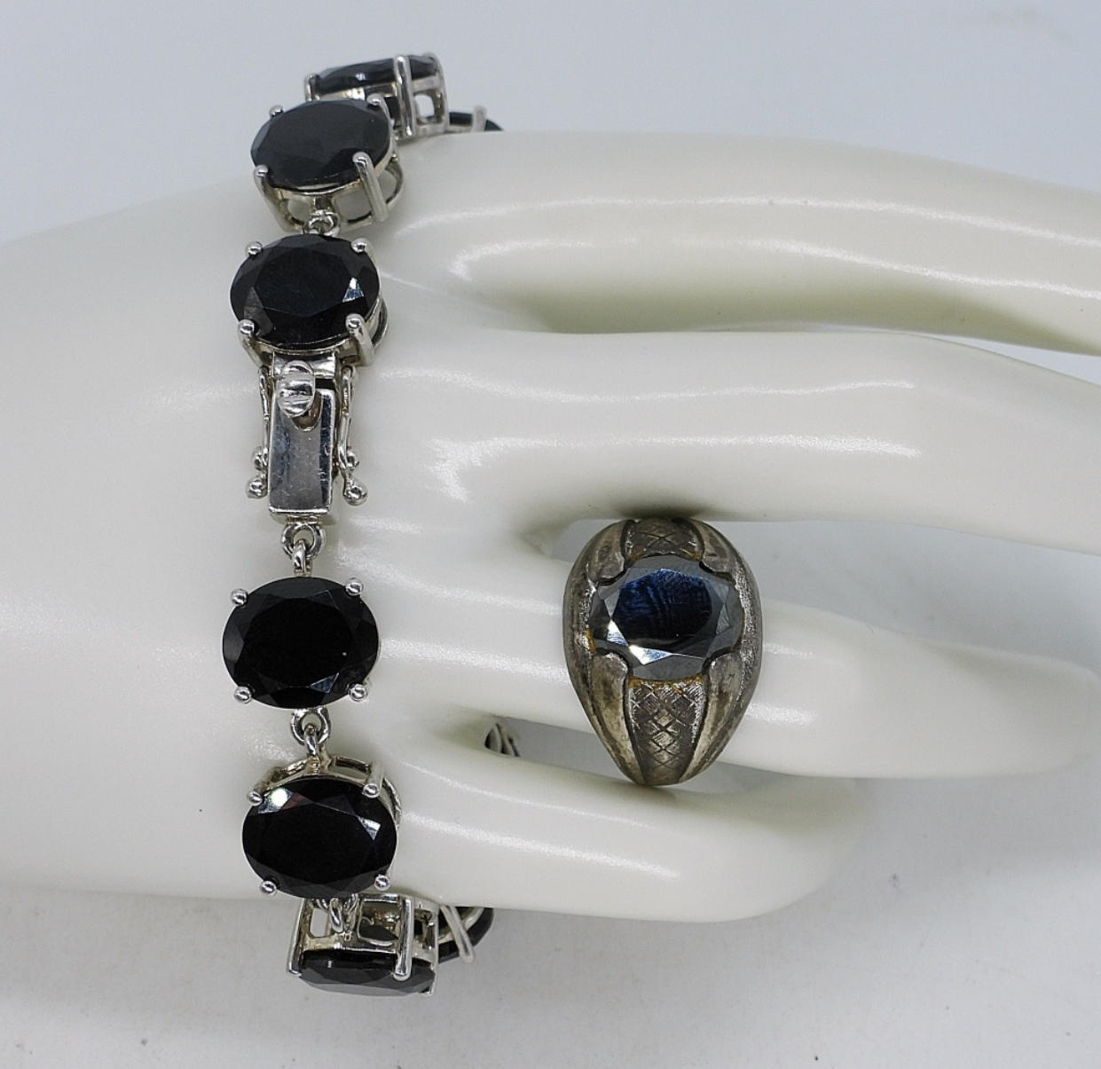 Sterling Vintage Jewelry with Black Onyx & Hematite Bracelet & Ring. 7″ & Ring Size 9. (23 DWT)