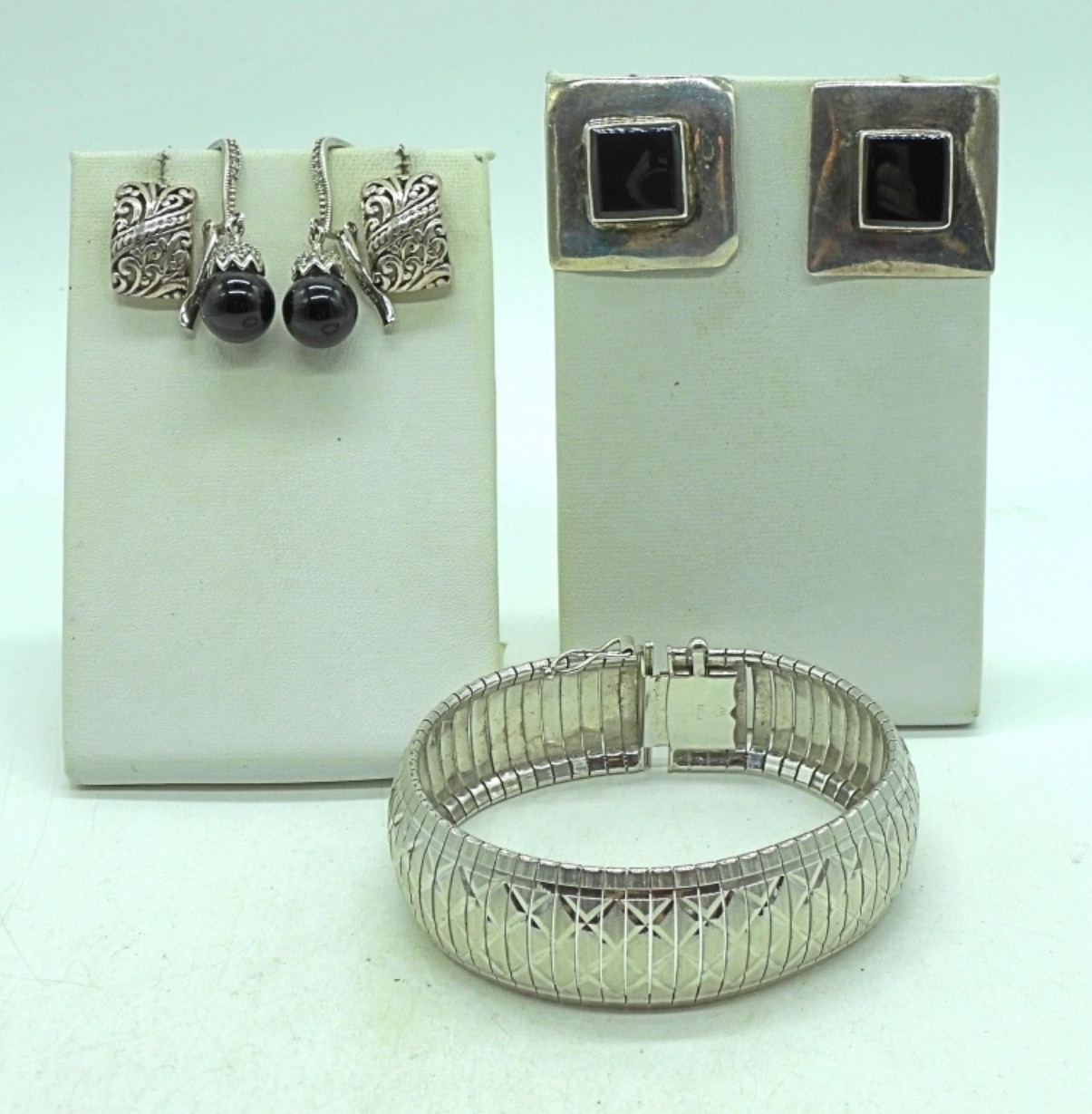 Sterling bracelet, 7.5″ (clasp sticks) 3 pair of pierced sterling earrings with black bead and onyx. (34.2 dwt)