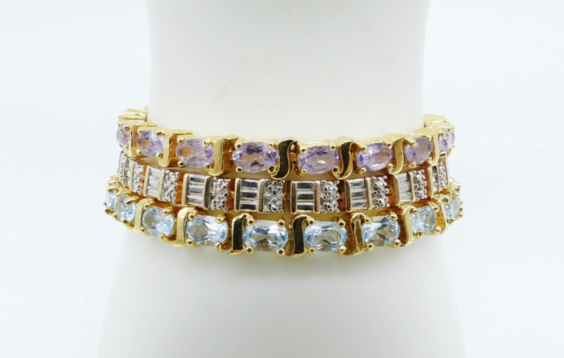 Three sterling silver, gold tone fashion bracelets. Amethyst & Blue Topaz . 7″ (31 DWT)