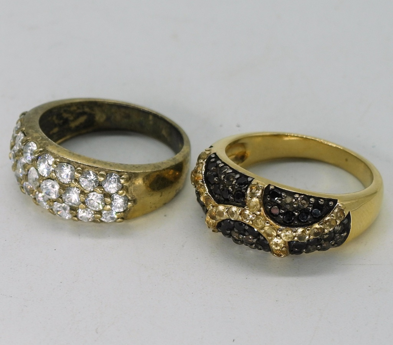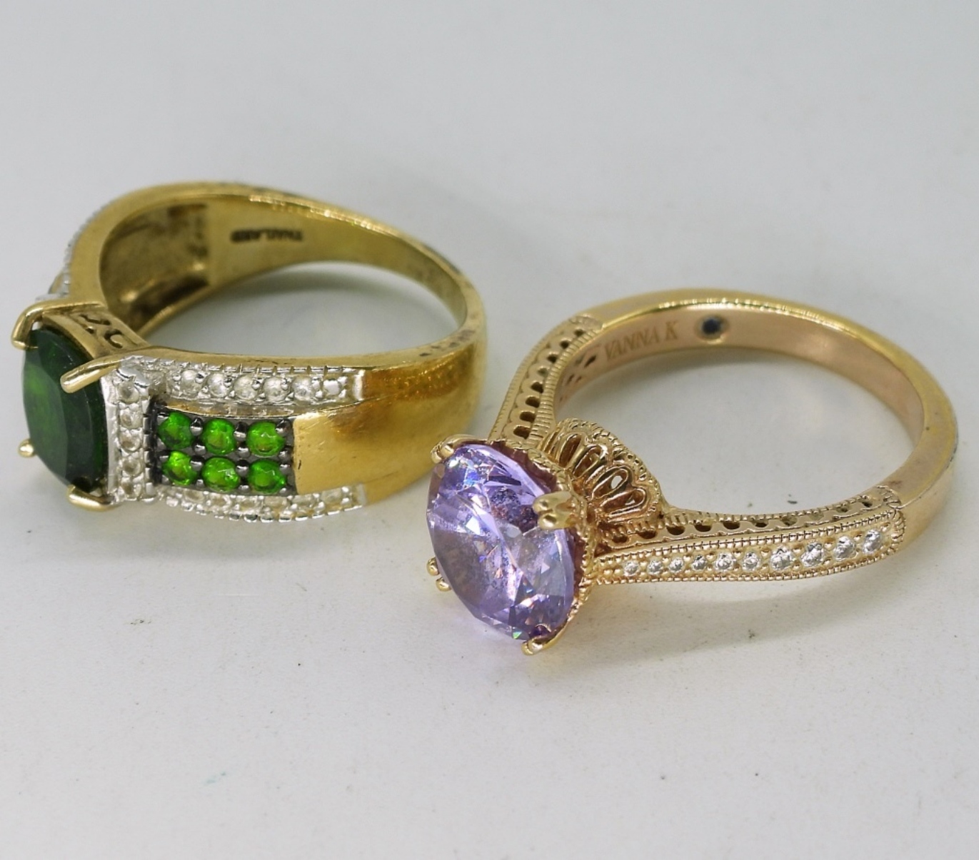 Four gold tone sterling rings, Beautiful simulated gemstones. Sizes 7-10. Gold tone sterling bracelet, 7.5″ (23.8 dwt)