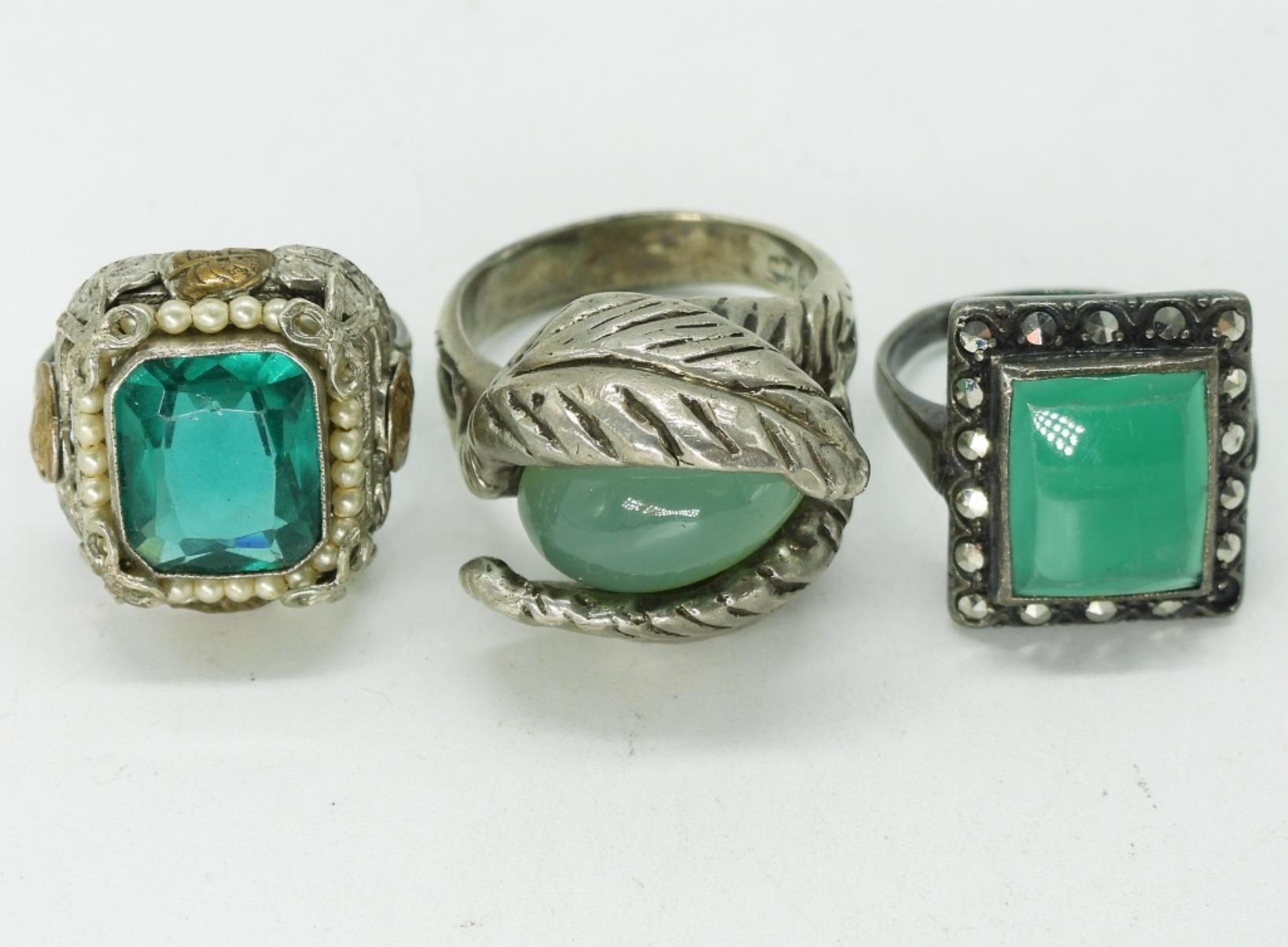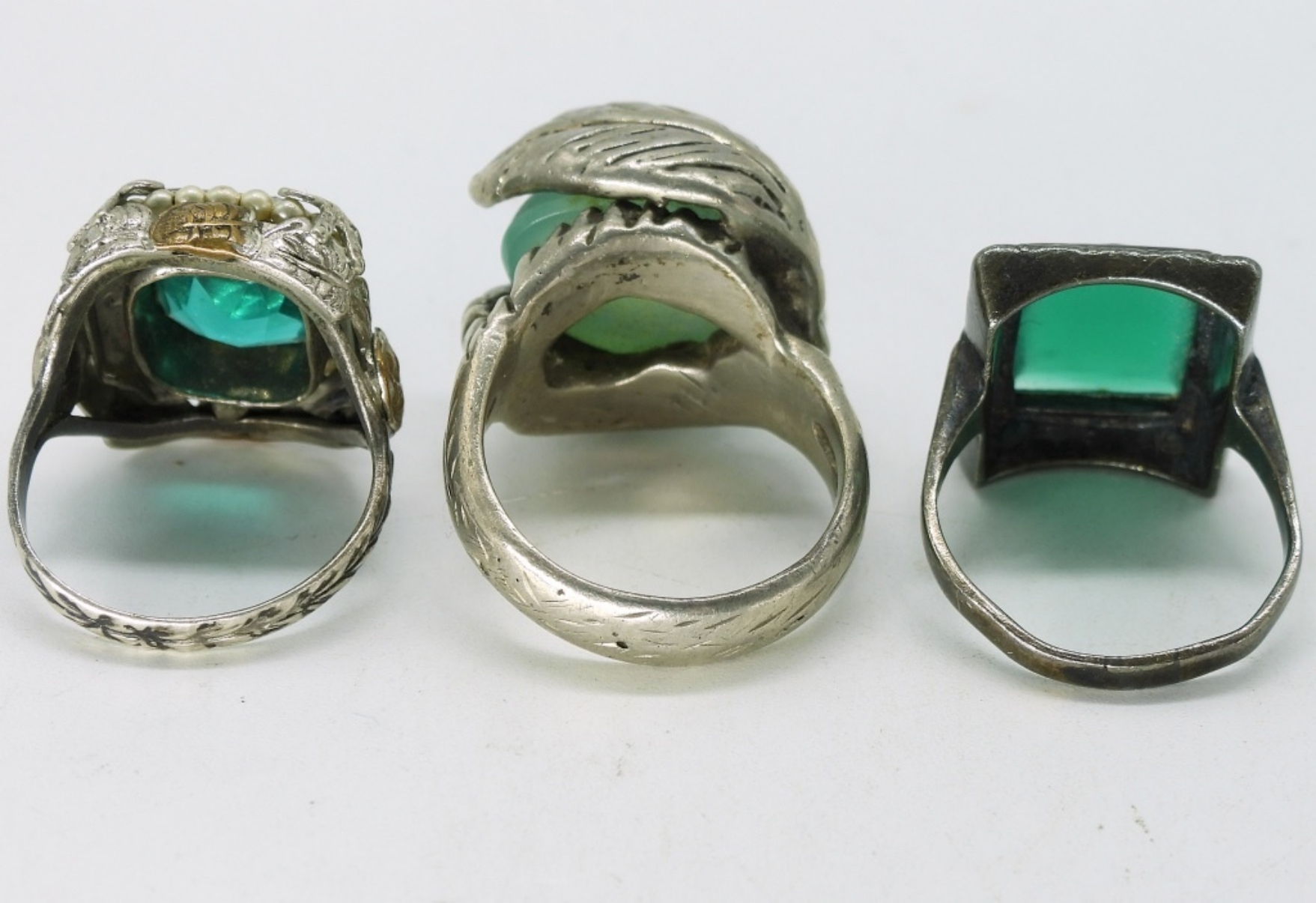 Green jade & simulated emerald sterling rings. Size 7-9. (19 dwt)