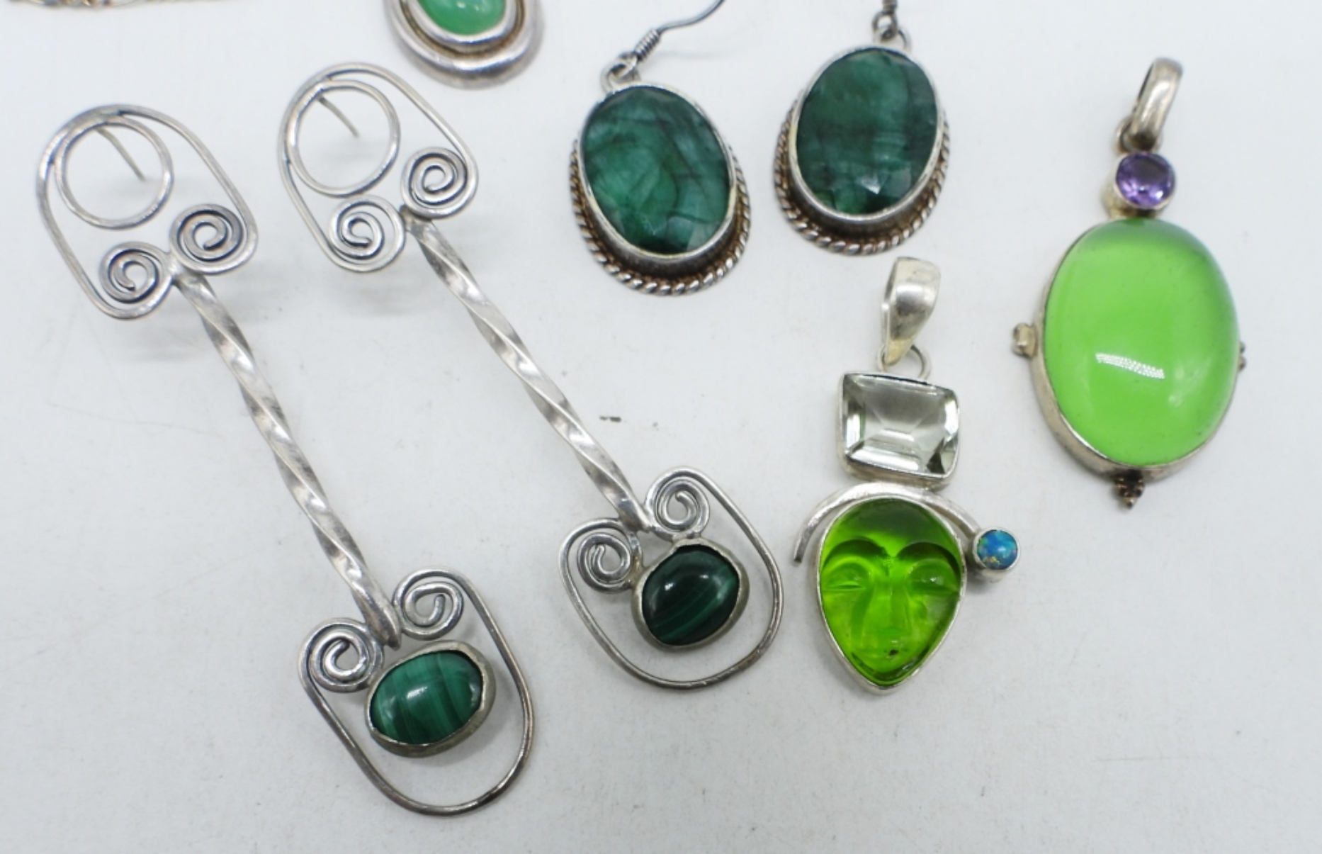 Two pair of pierced earrings, small malachite earrings, 3″, emerald earrings, 2″. Three pendants, one jade on a 18″ sterling chain.