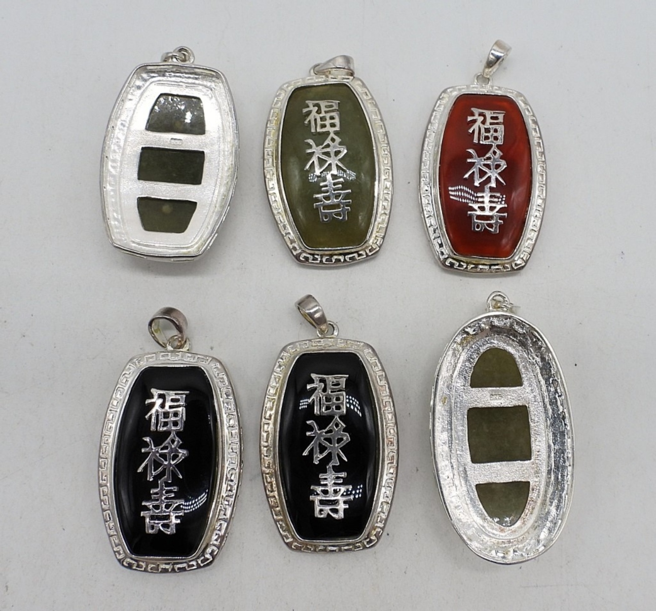 6 Sterling gemstone “good fortune” pendants with writing. Marked 925. Pendants are 1.5″ Long. (28 DWT)