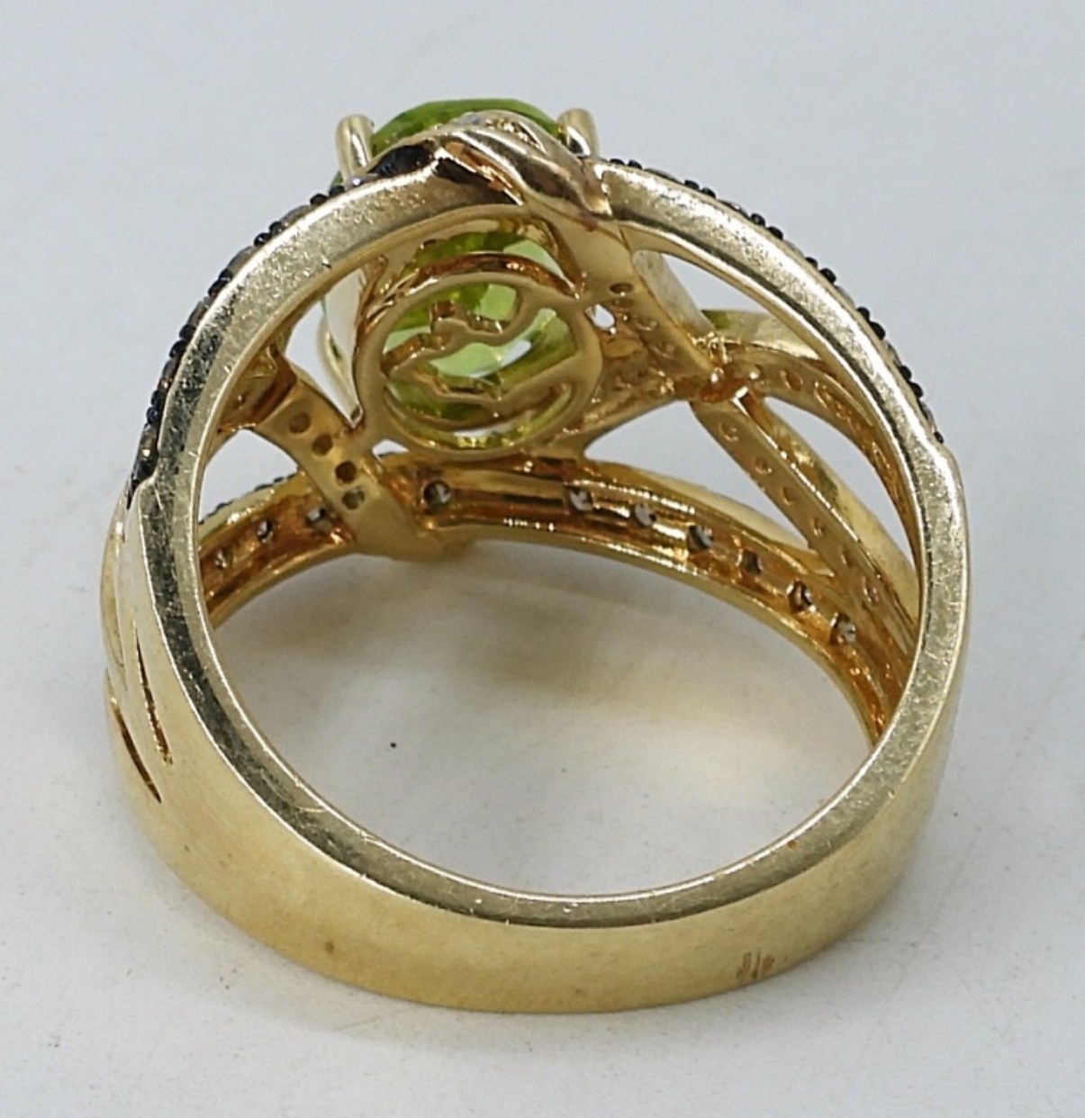 14k yellow gold Peridot center stone. White and Champagne Diamonds. EFFY brand. Size 6 (3.6 dwt with stones).