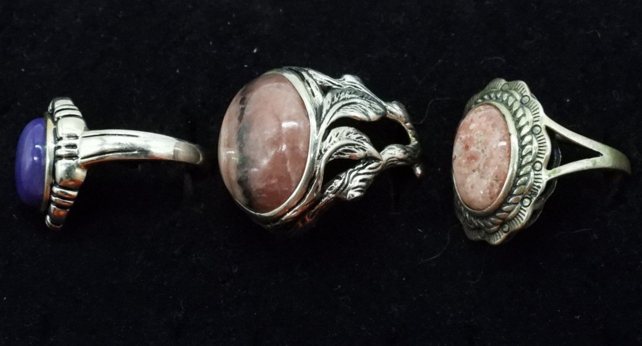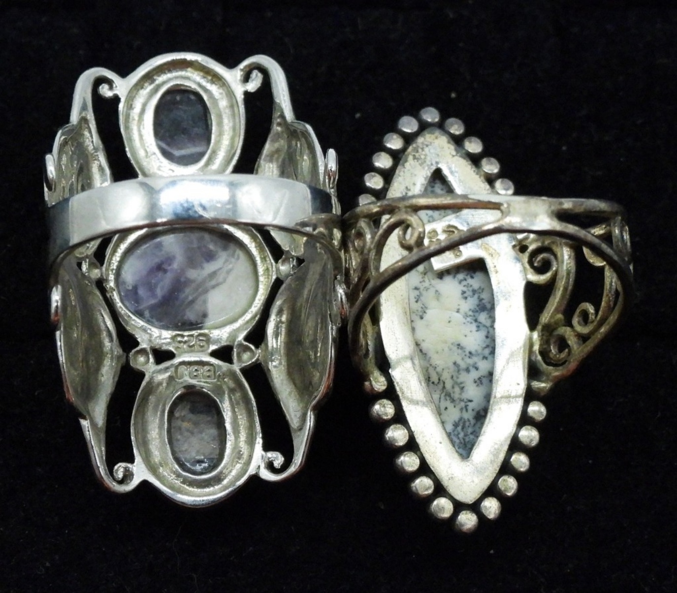 Five sterling rings. Two are rhodochrosite, size 8. One Charoite, size 10. Amethyst & Dendrite Opal (black and white), sizes 9 & 10. (25 dwt)