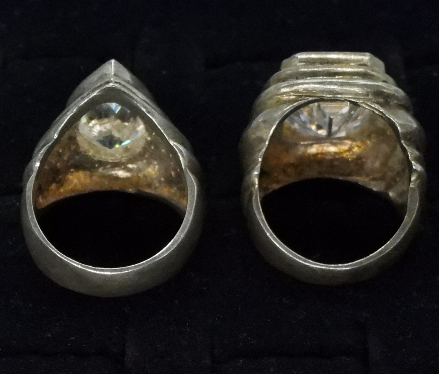 Two sterling simulated diamond rings. Large gemstones, size 8 & 8.5 (19.8 dwt)