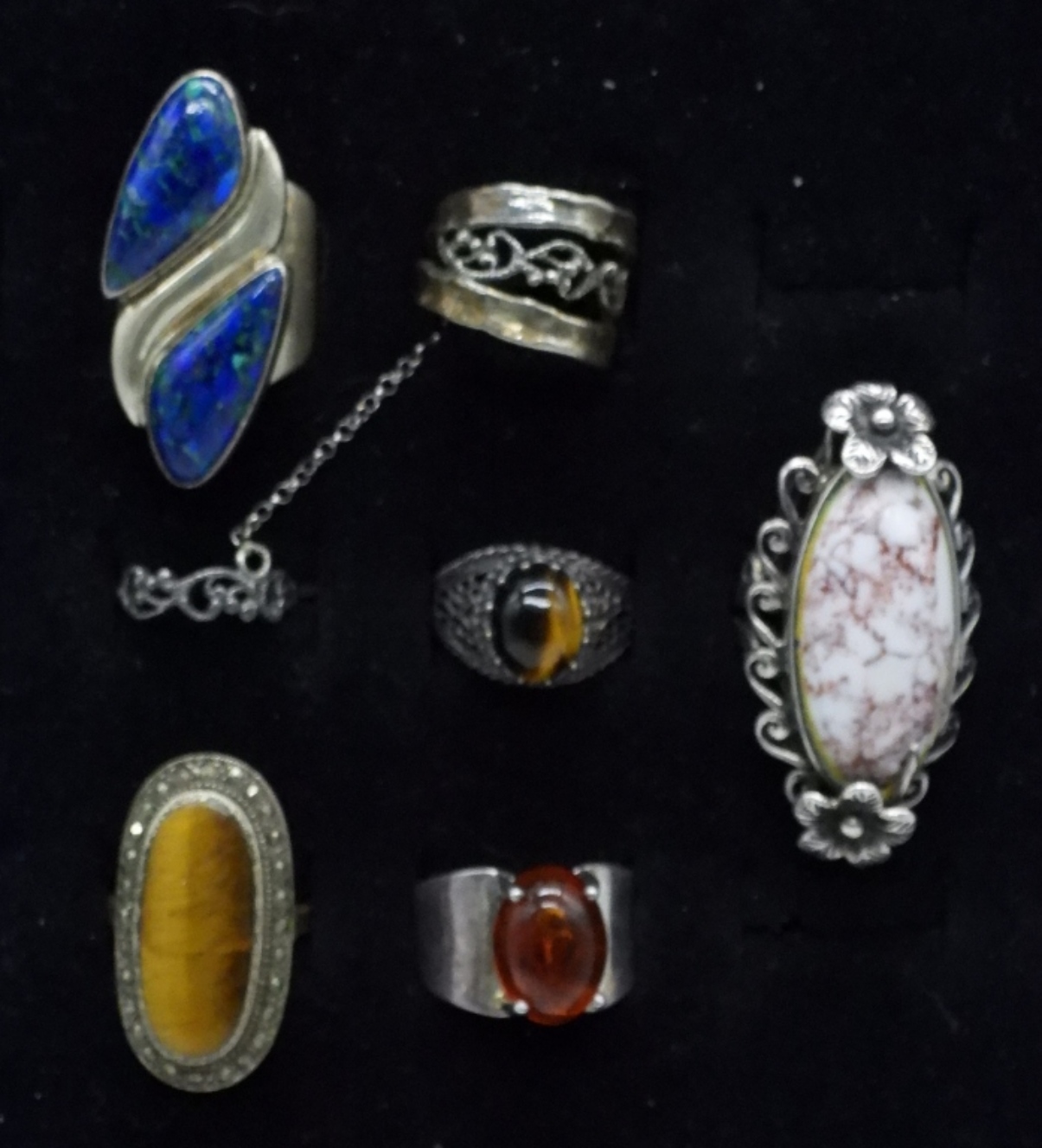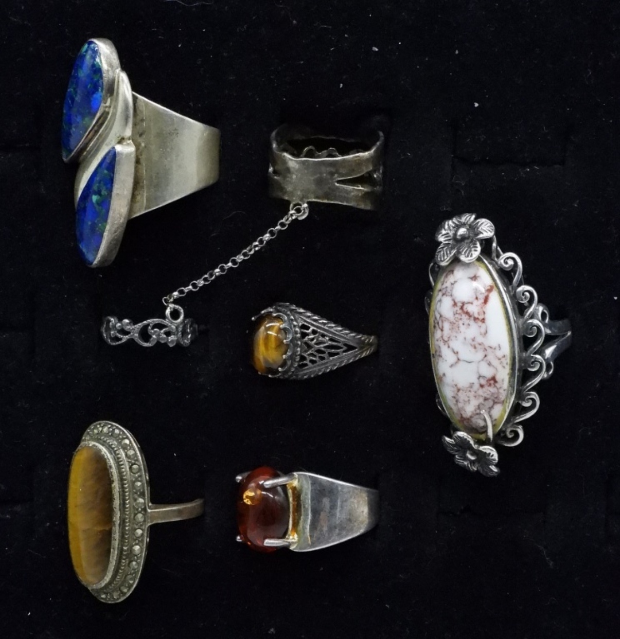 Six fun sterling gemstone rings. Sizes 5.5-9 Amber, Lapis Lazuli, Tigers Eye. (32 dwt)