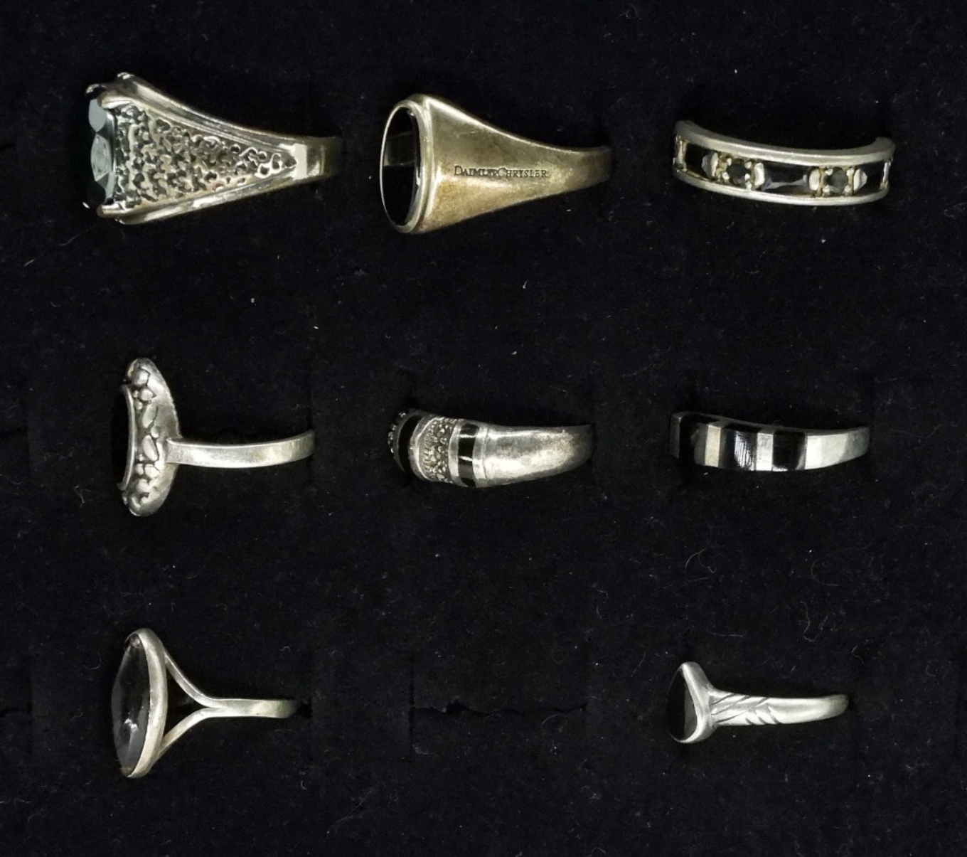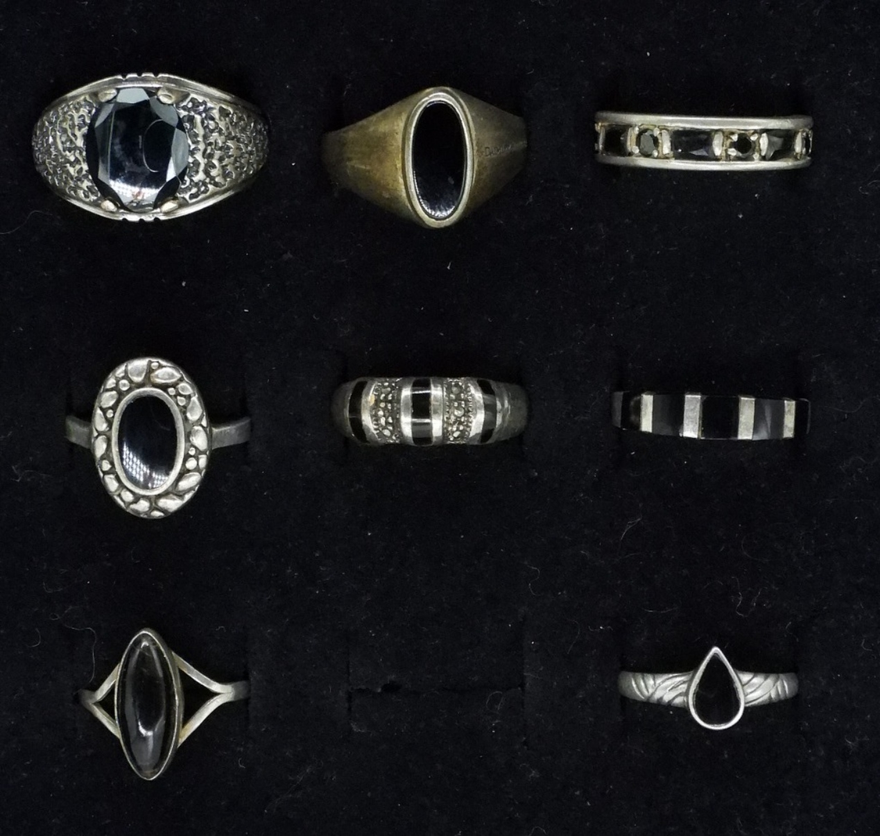 Eight sterling black onyx and hematite rings. Sizes 6.5-11 (21.2 dwt)