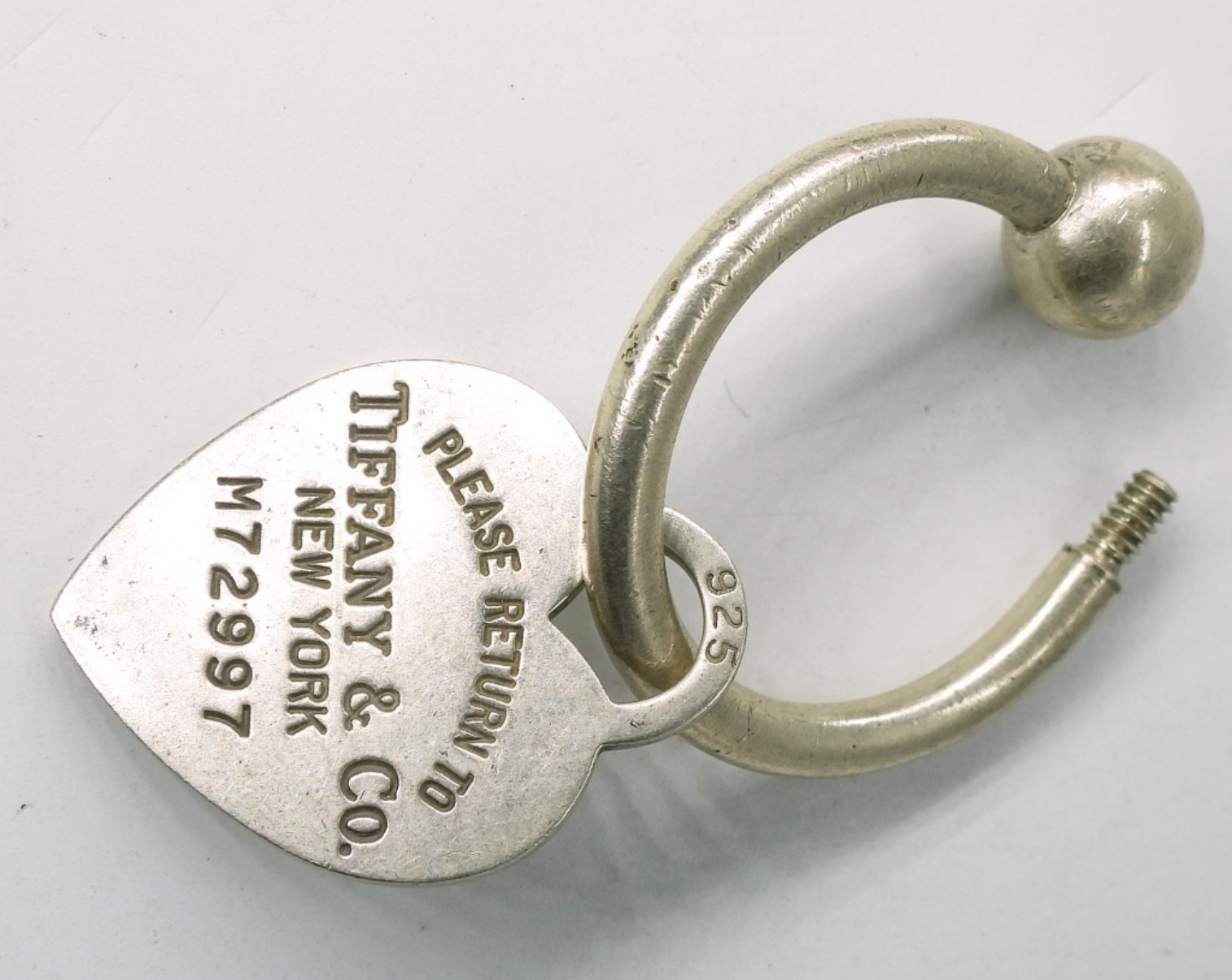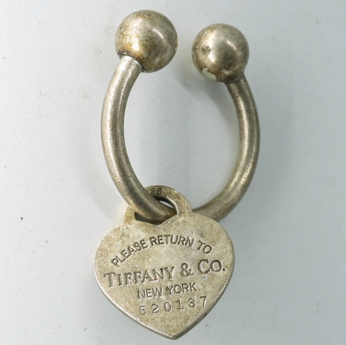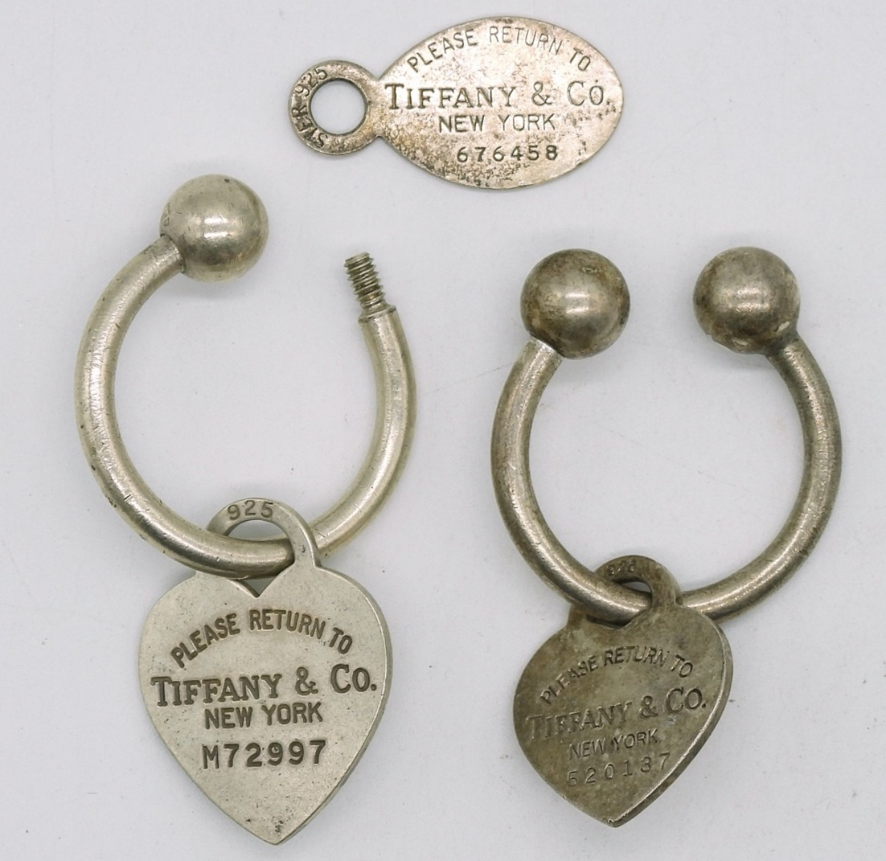 One intact Tiffany & Co “please return to” keychain. Similar keychain missing one ball. Keychain tag, no keychain. All Sterling. (27.7 dwt)