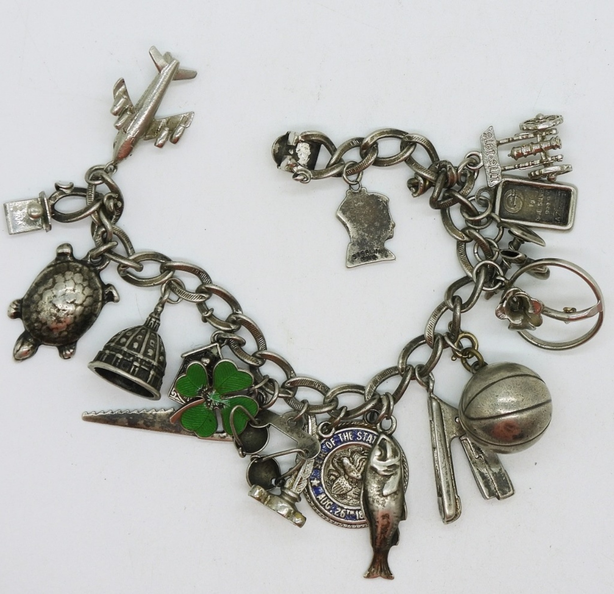 Heavy sterling charm bracelet, 7″. 18 sterling charms. (39 dwt)