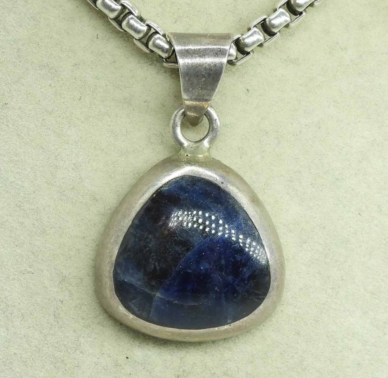 Vintage Taxco Sterling Sodalite Pendant (1.5″) on a thick 22″ sterling chain. (28 dwt)