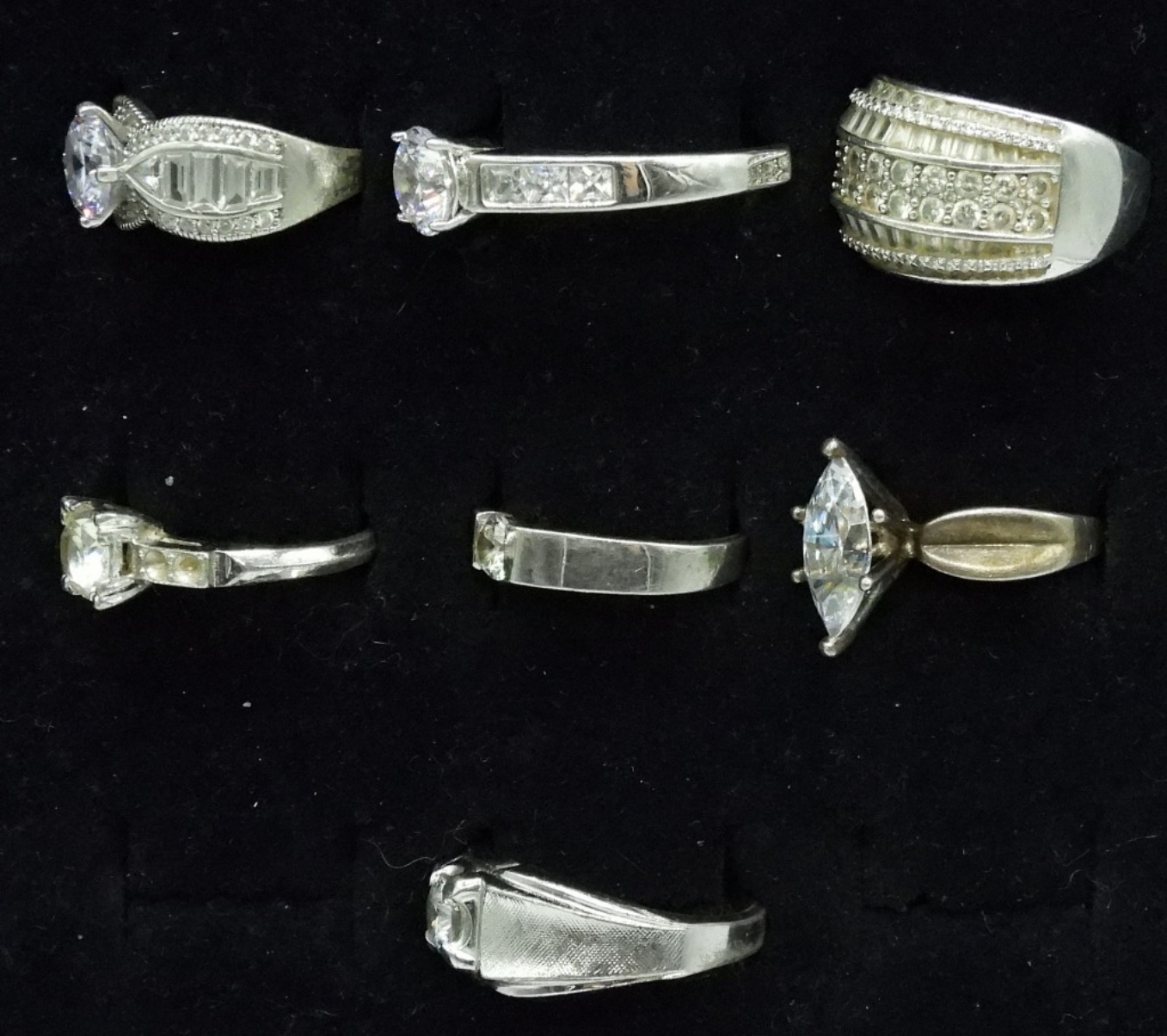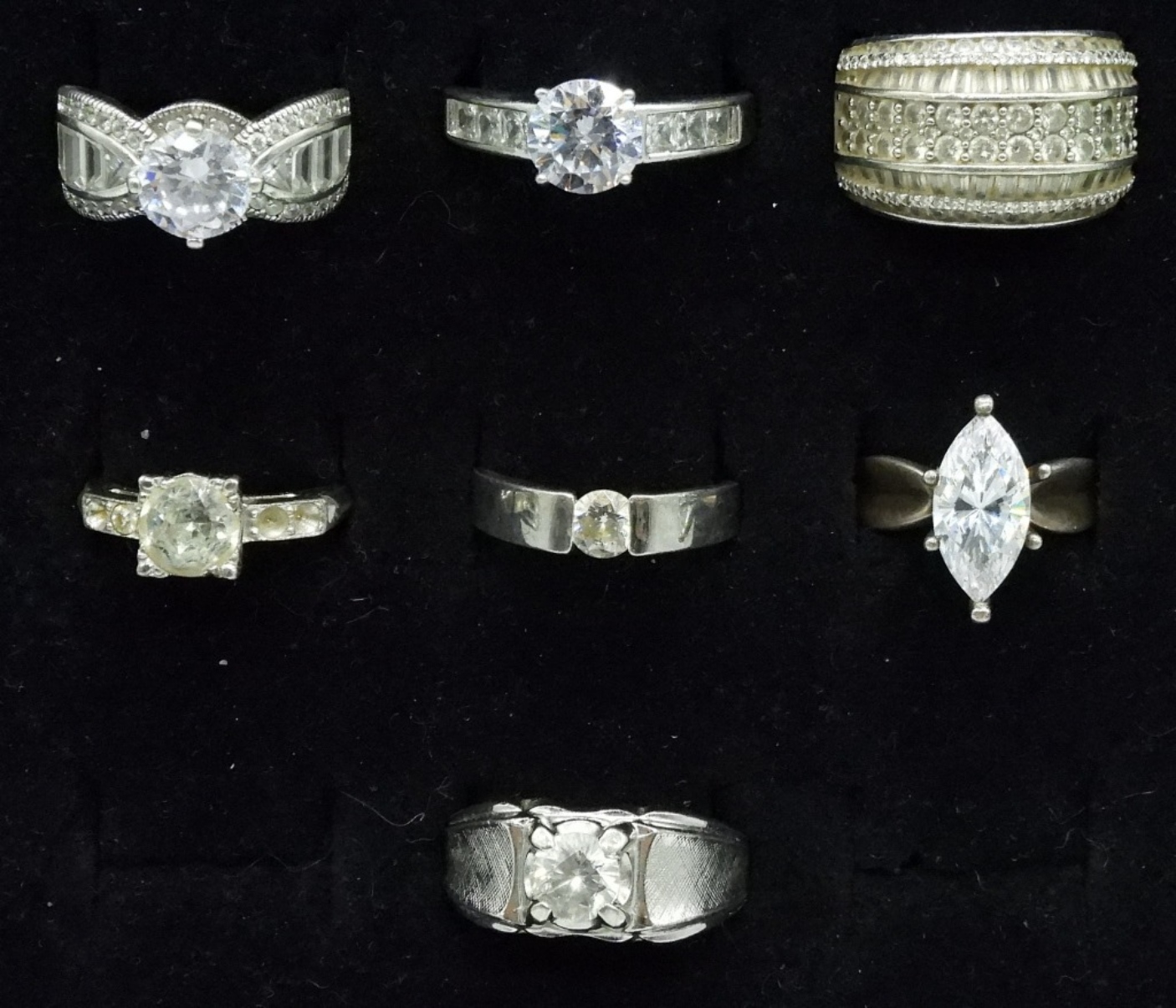 Seven sterling bridal style fashion rings. Simulated diamonds. Sizes 6.5-11 (25.6 dwt)