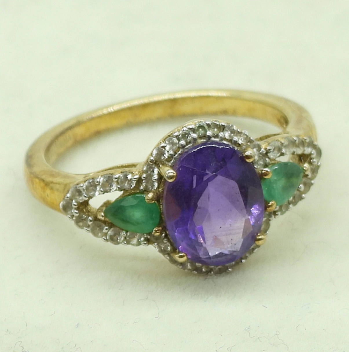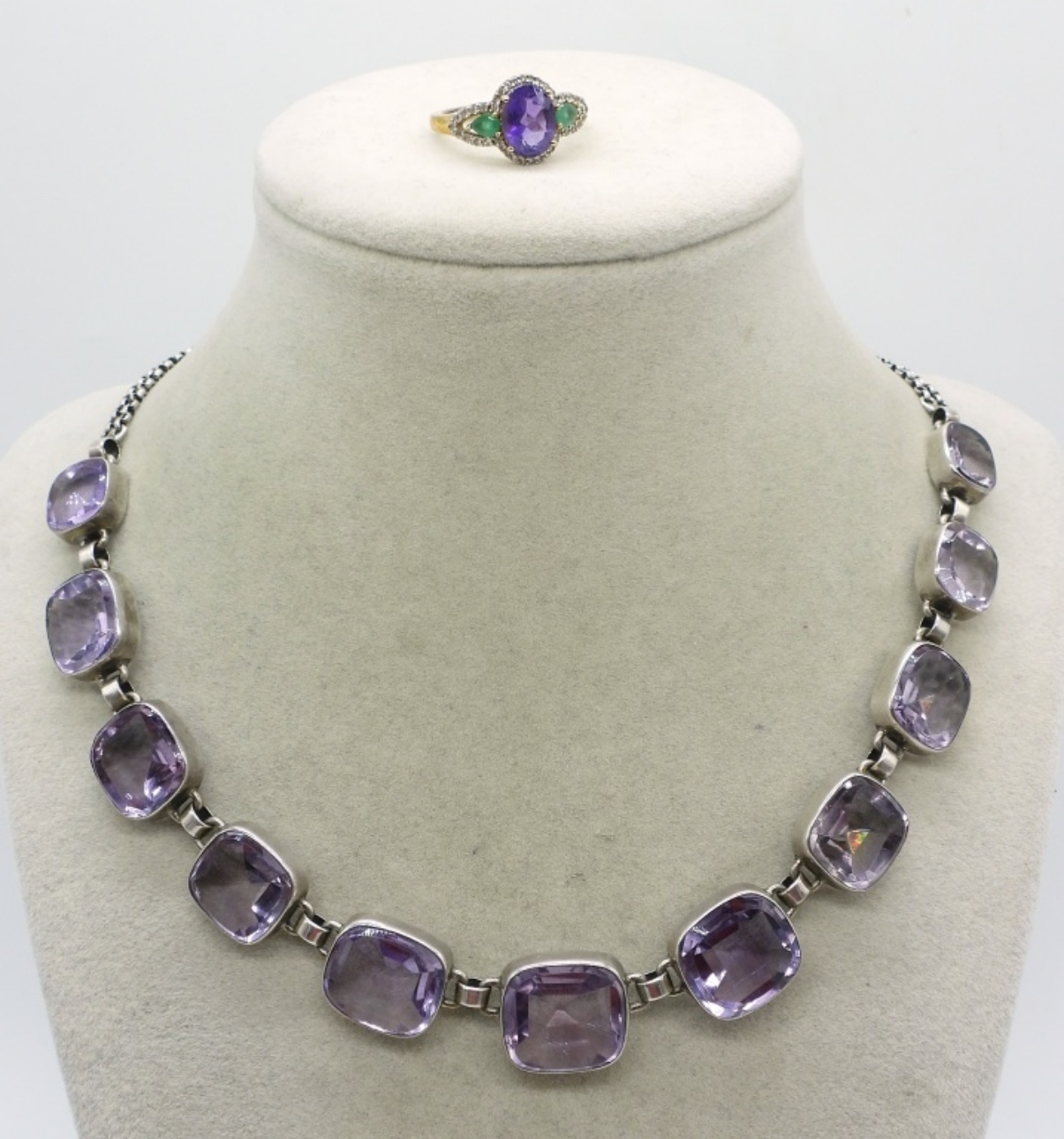 Large amethyst sterling necklace, 17″. Gold tone ring with amethyst, size 7. (24 dwt)