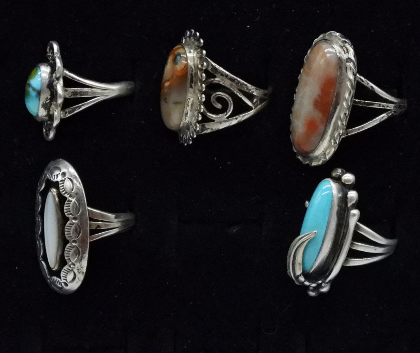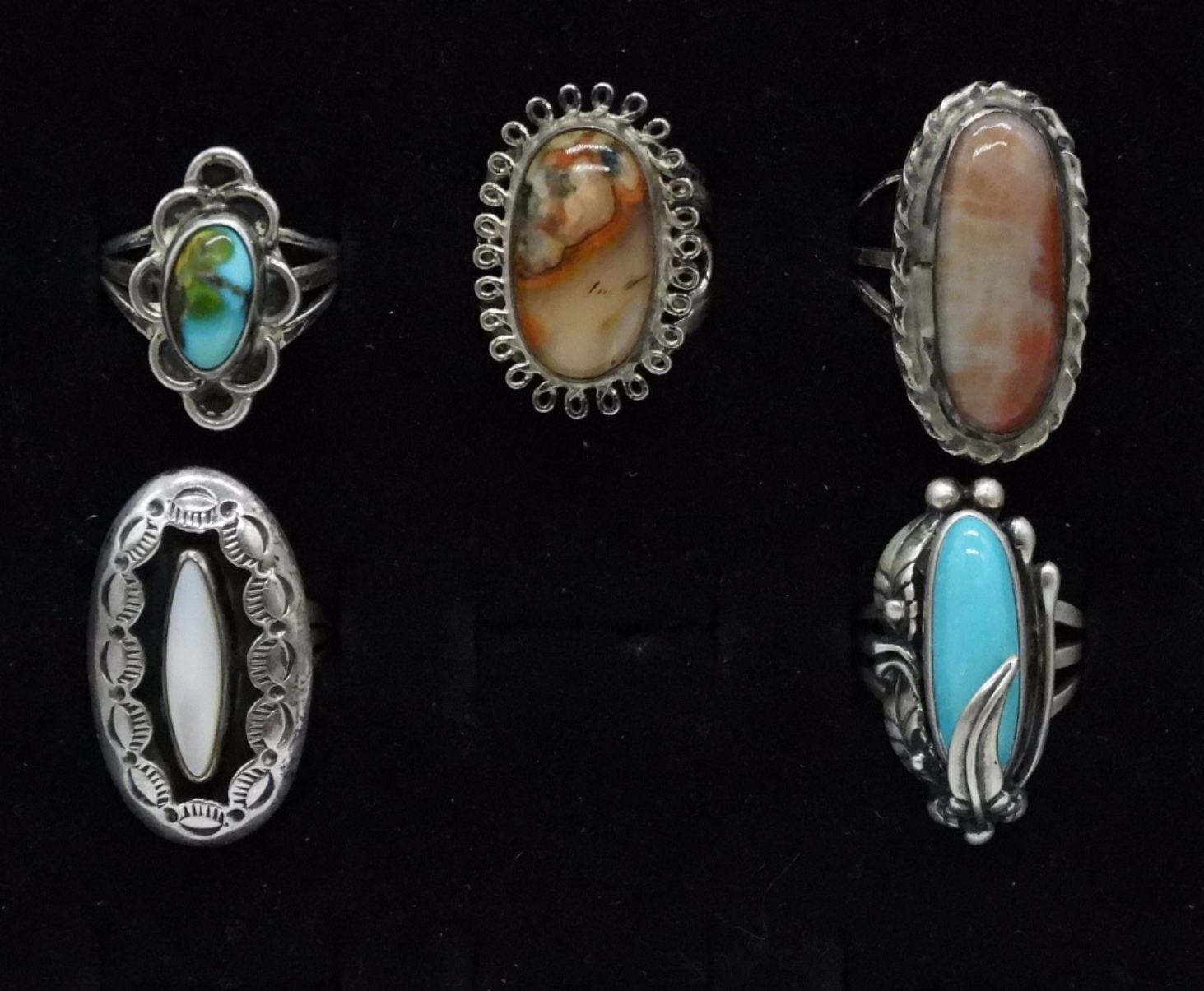 Five sterling rings. Turquoise, Agate and Mother of Pearl gemstones. Sizes 5.5-9 (22 dwt)