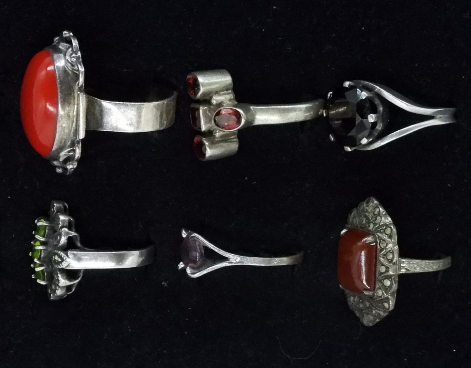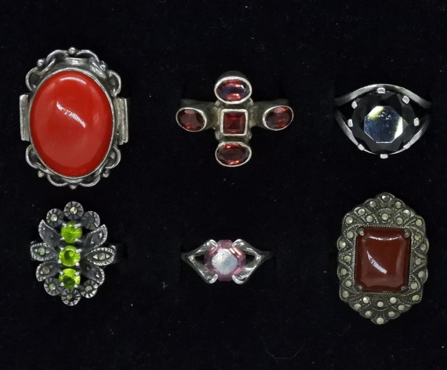 Six sterling rings, sizes 6-9. Peridot, Garnet & more unidentified. (24 dwt)