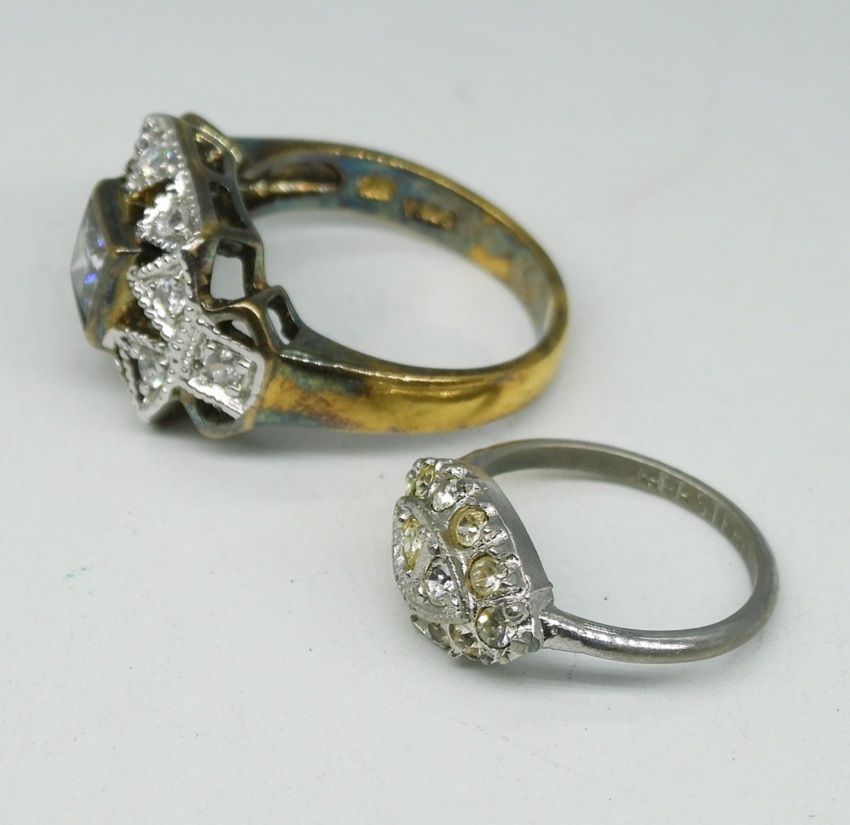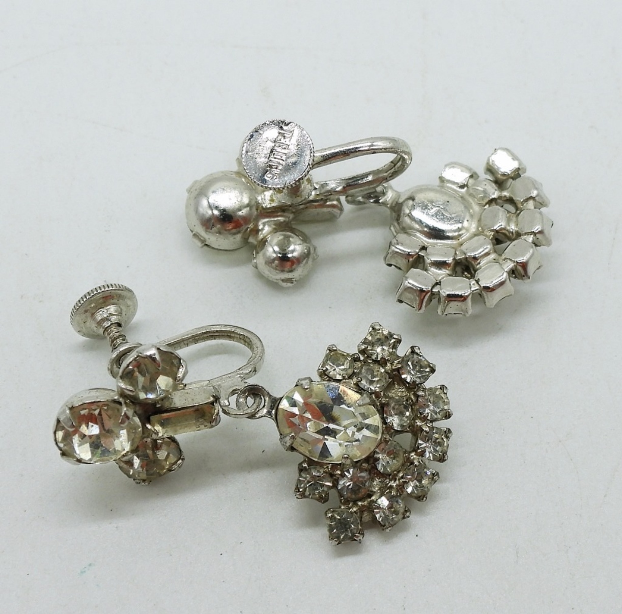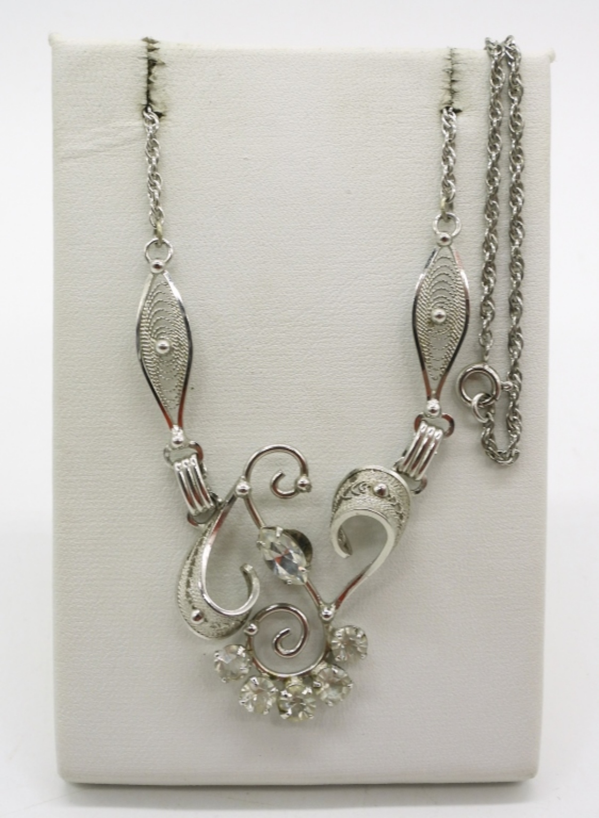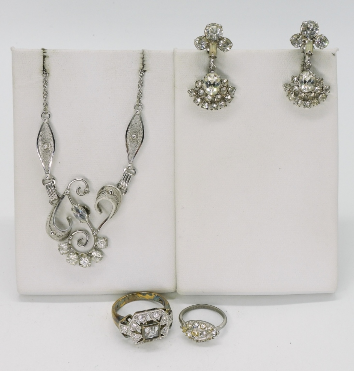 Vintage sterling rhinestone set. Necklace 16″. Screw back earrings. Two rings, sizes 2.5 & 7. (14.4 dwt)