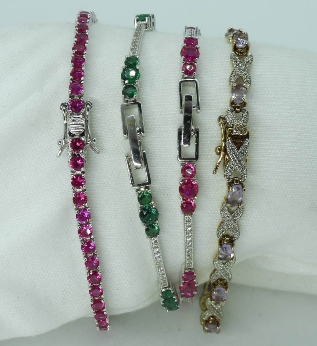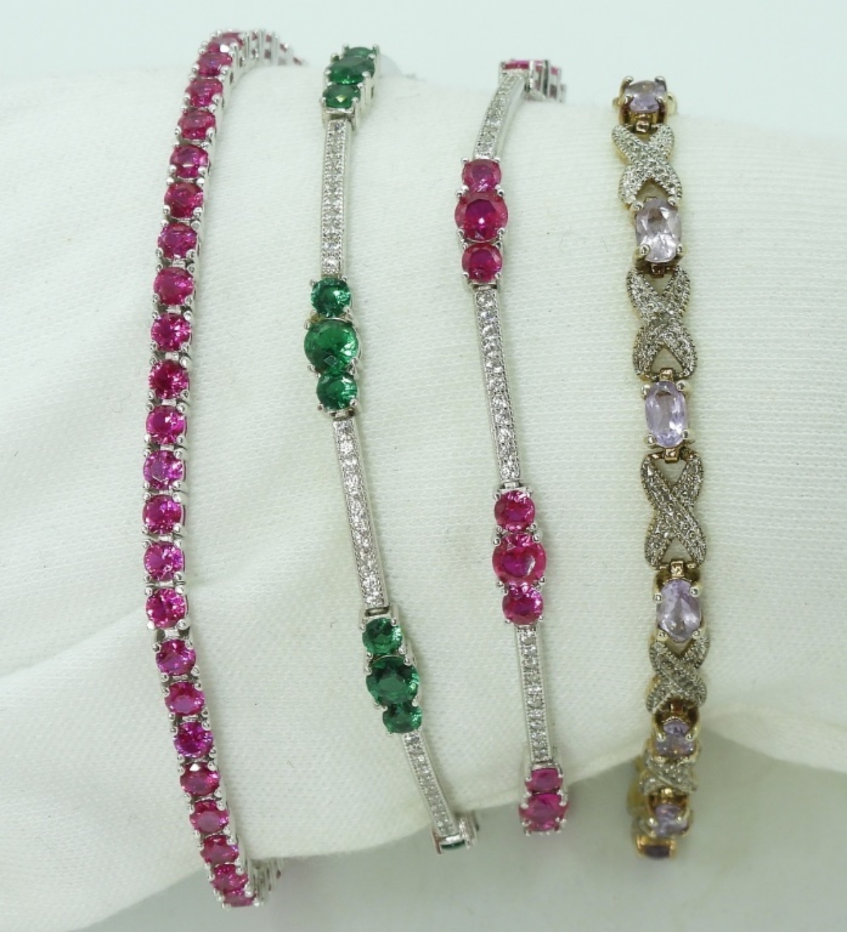 Four sterling tennis bracelets with simulated gemstones. 7-7.5″. (19 dwt)