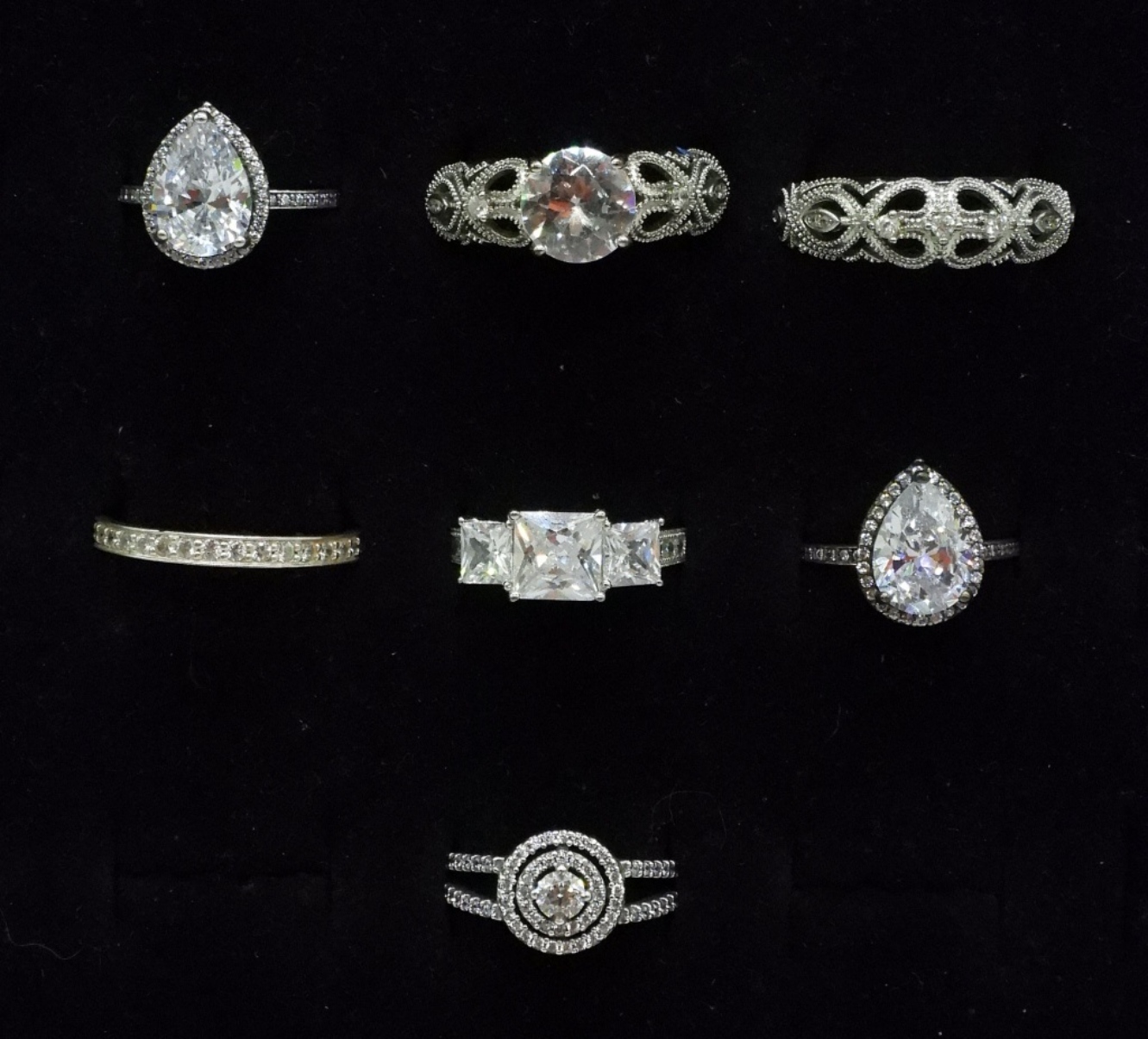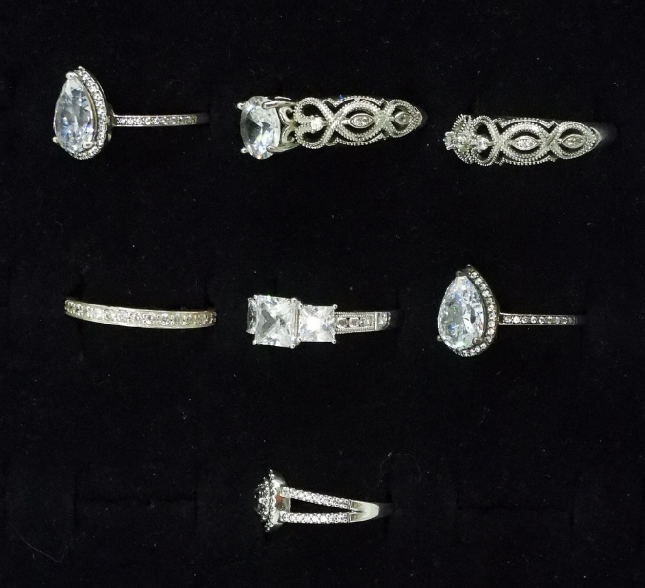 Seven sterling bridal style rings, sizes 9-10.5 (15.6 dwt)
