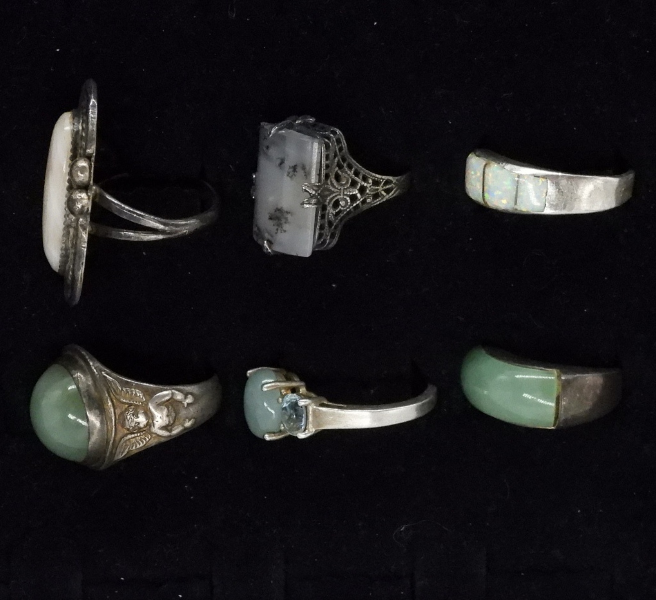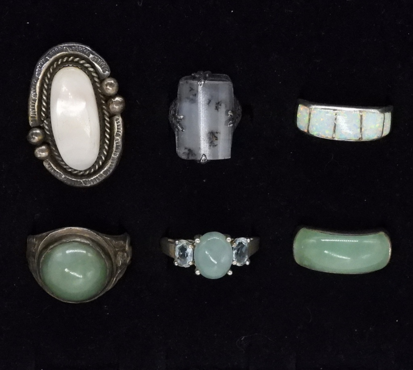 Six sterling rings. Jade, Mother of Pearl, Dendric Moss Agate, Opal. Sizes 5-9 (24 dwt)