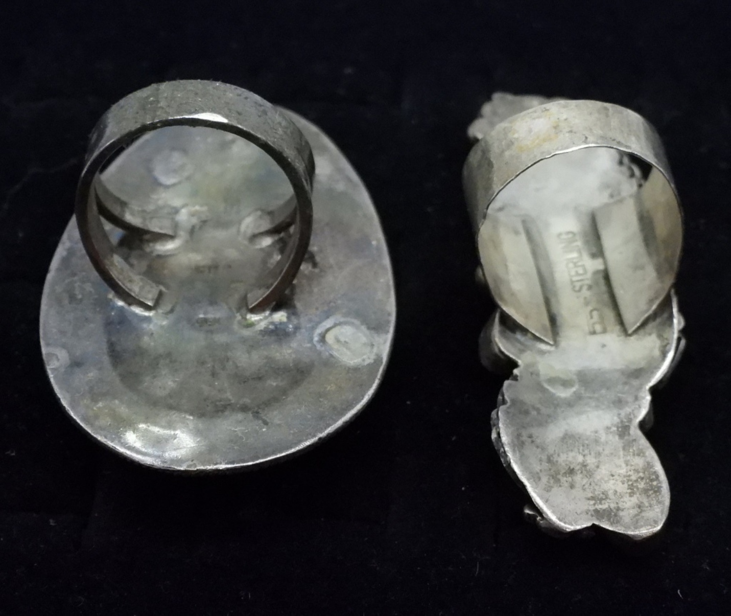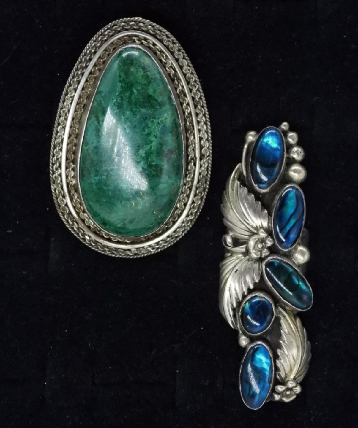 Two sterling rings. One with blue colored abalone shell, size 9.5 & 2.5″ long. Malachite sterling ring, size 9 & 2″ long. (26 dwt)