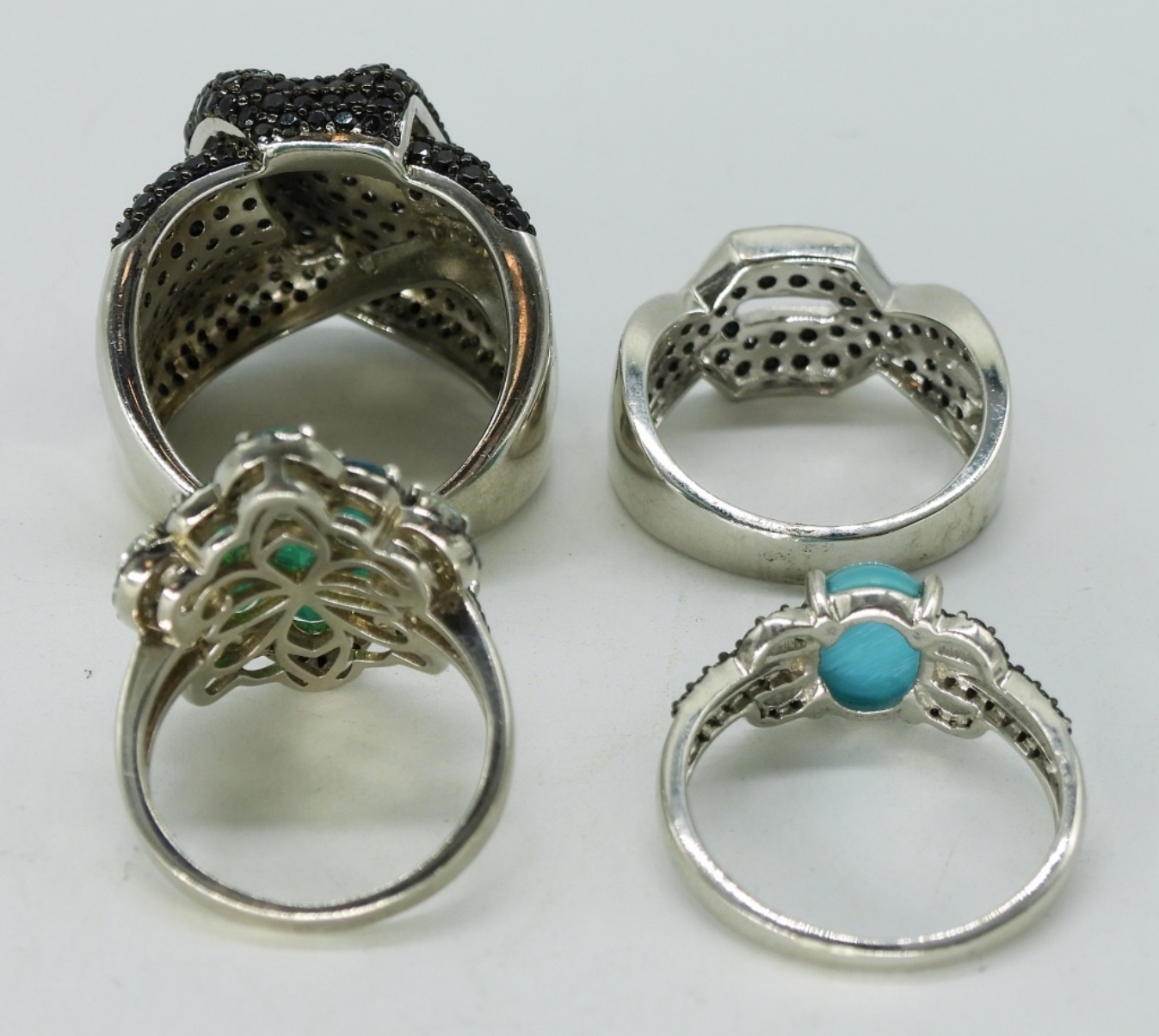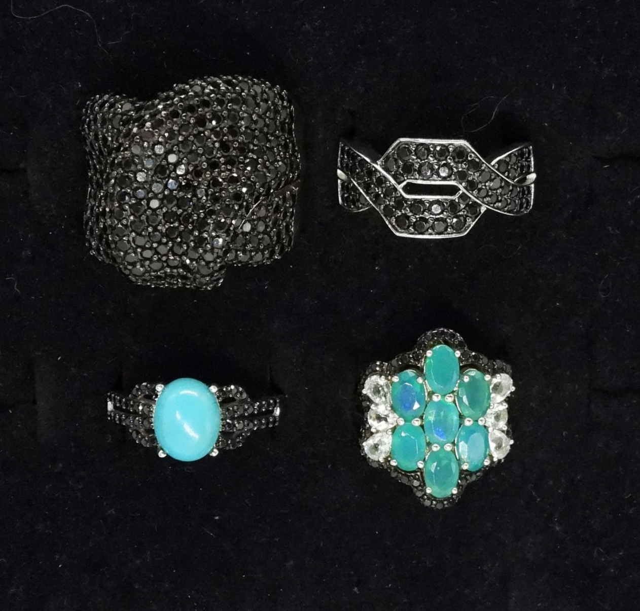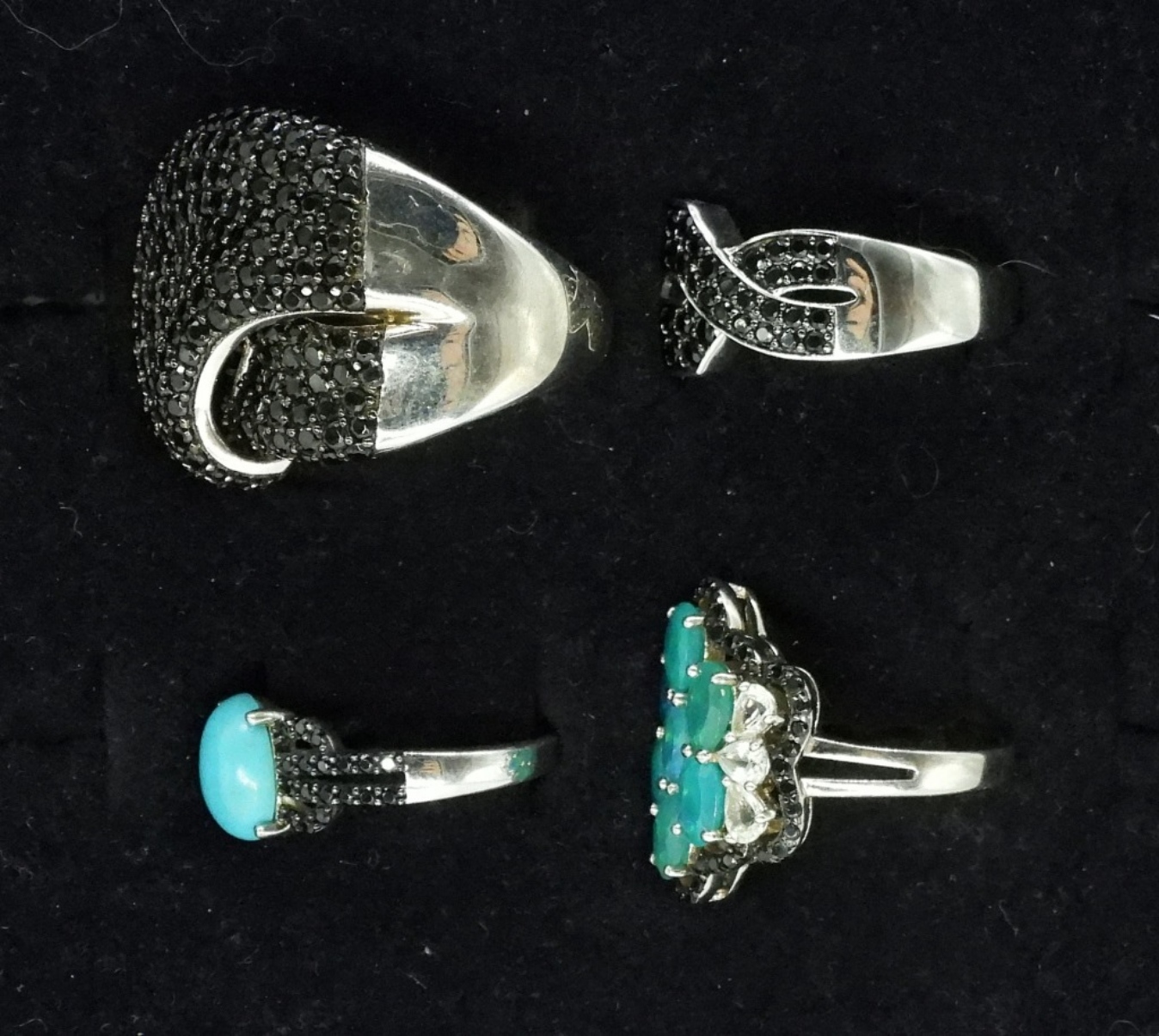 Four sterling rings. Spinel, Turquoise & Opal. Sizes 7, 9, 10, 11. (20 dwt)