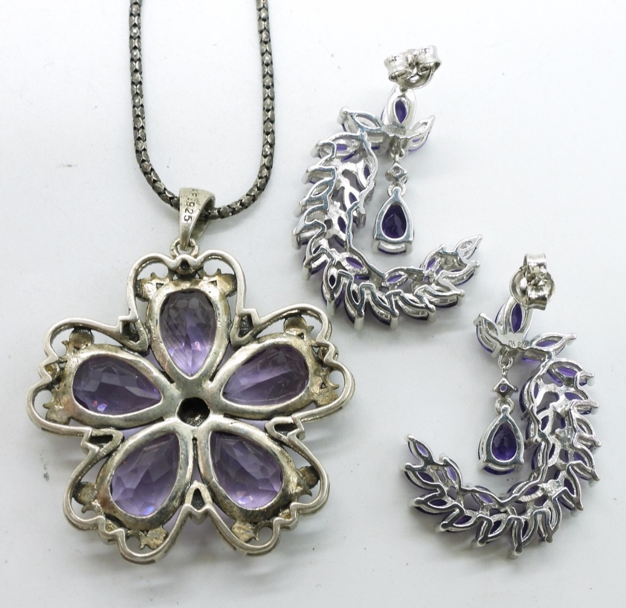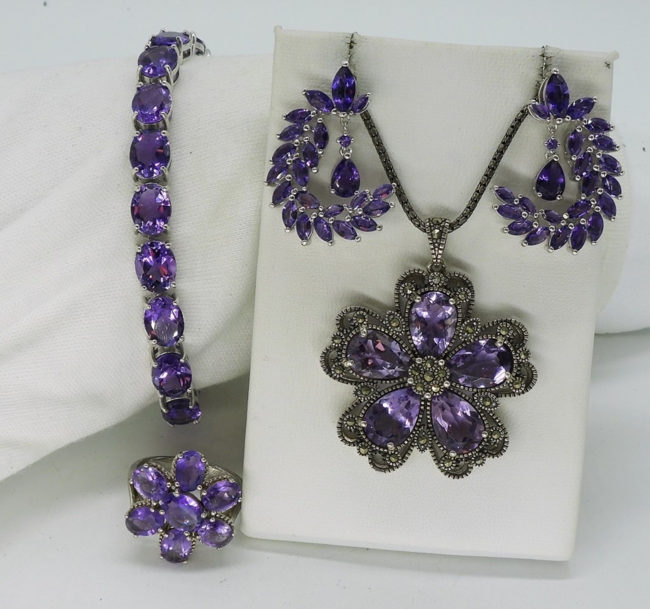 Sterling silver with amethyst gemstones and marcasite. Necklace is 18″. Pendant is 2″. Bracelet 7.5″. Ring size 8. Pierced earrings, 1″. (31.5 dwt)