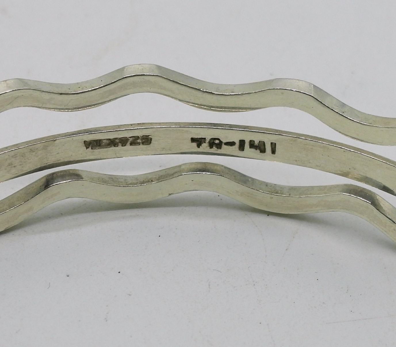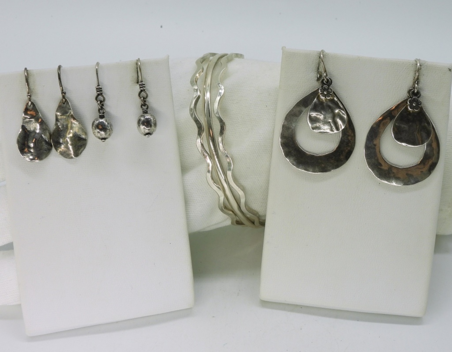Taxco sterling 3 piece bangle bracelet, TA-141. Three pair of sterling pierced earrings. (24.7 dwt)