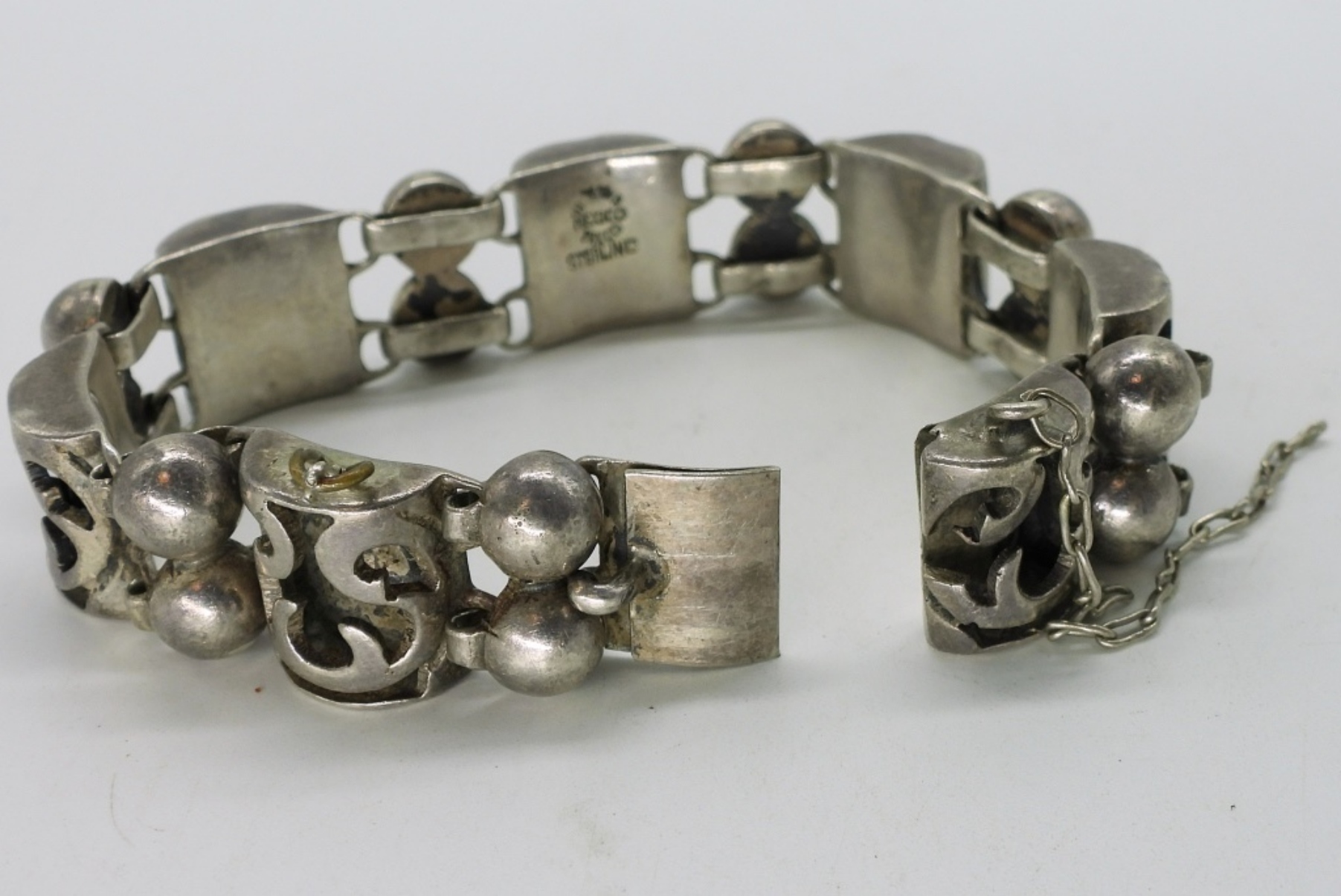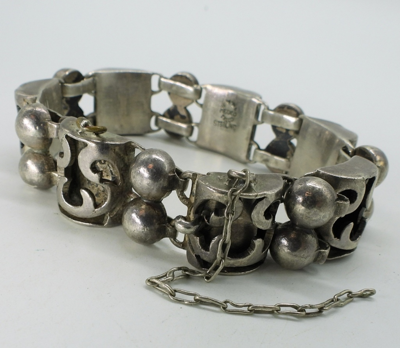 Taxco sterling bracelet, 7.5-8″. Clasp works, safety chain broken. (32 dwt)