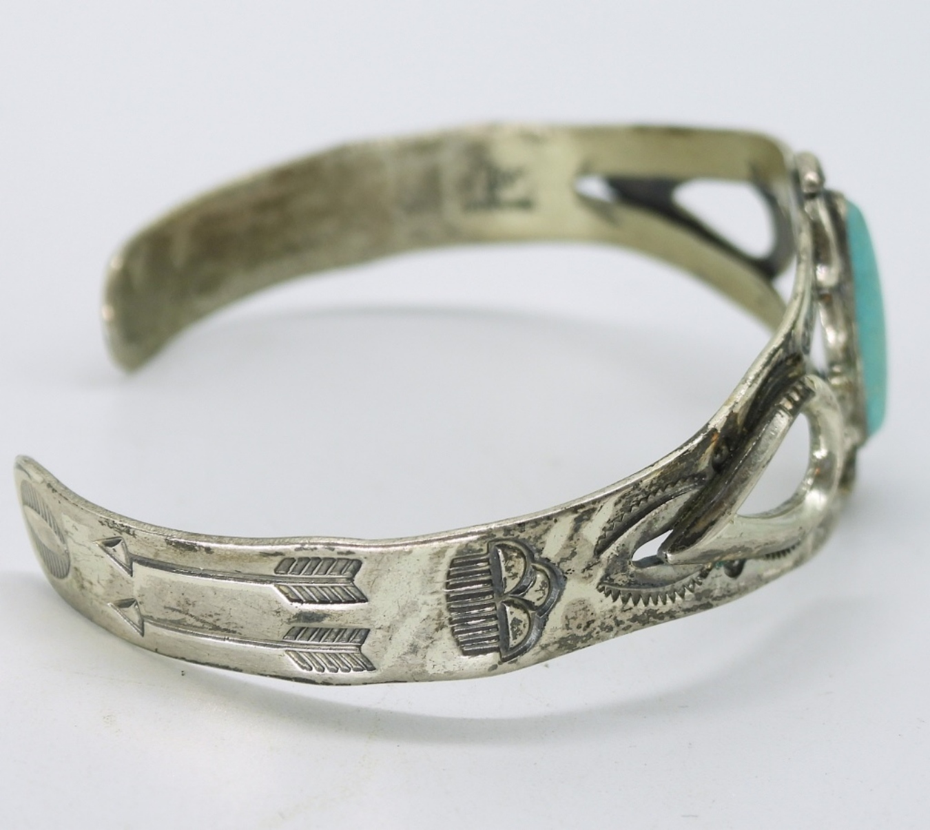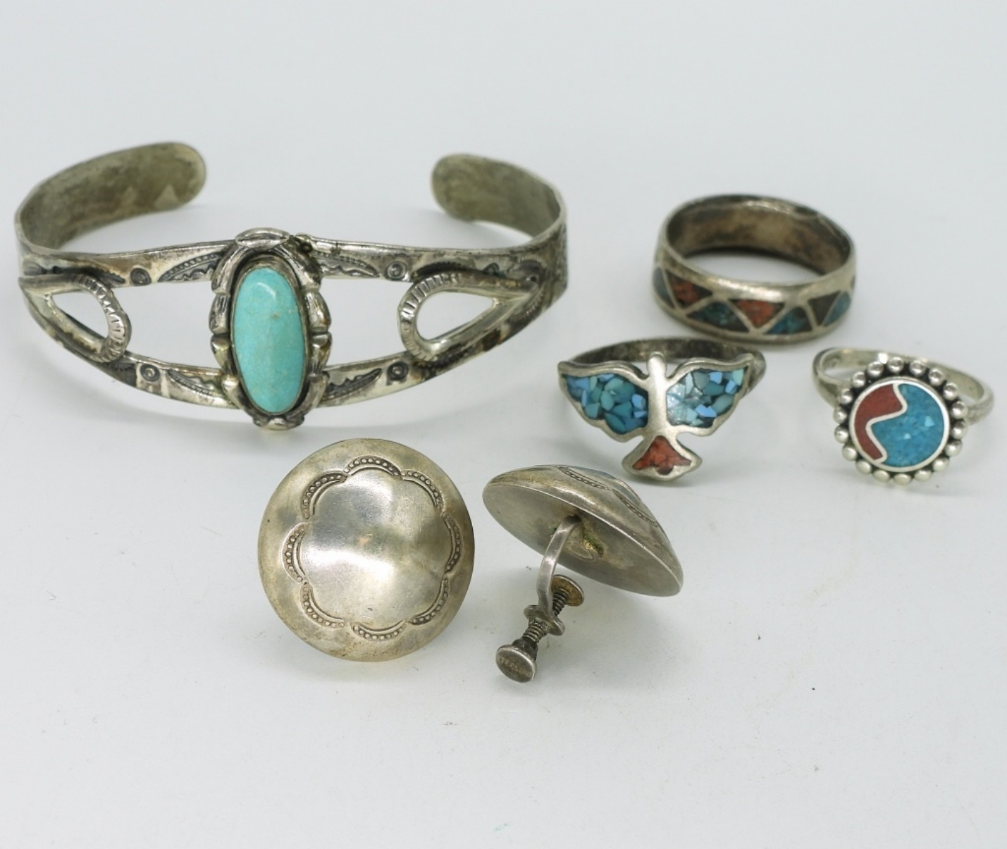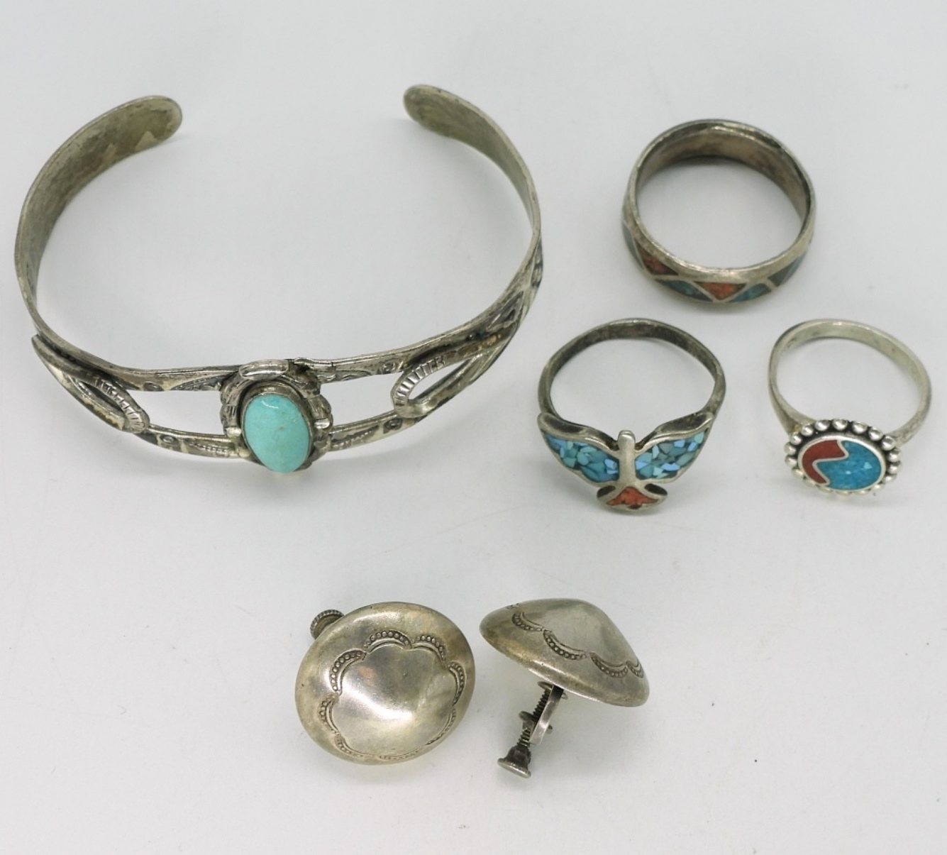 Three sterling rings with turquoise inlay. Sizes 6, 8, 9. Sterling screw back earrings. Sterling turquoise cuff bracelet. (21.3 dwt)