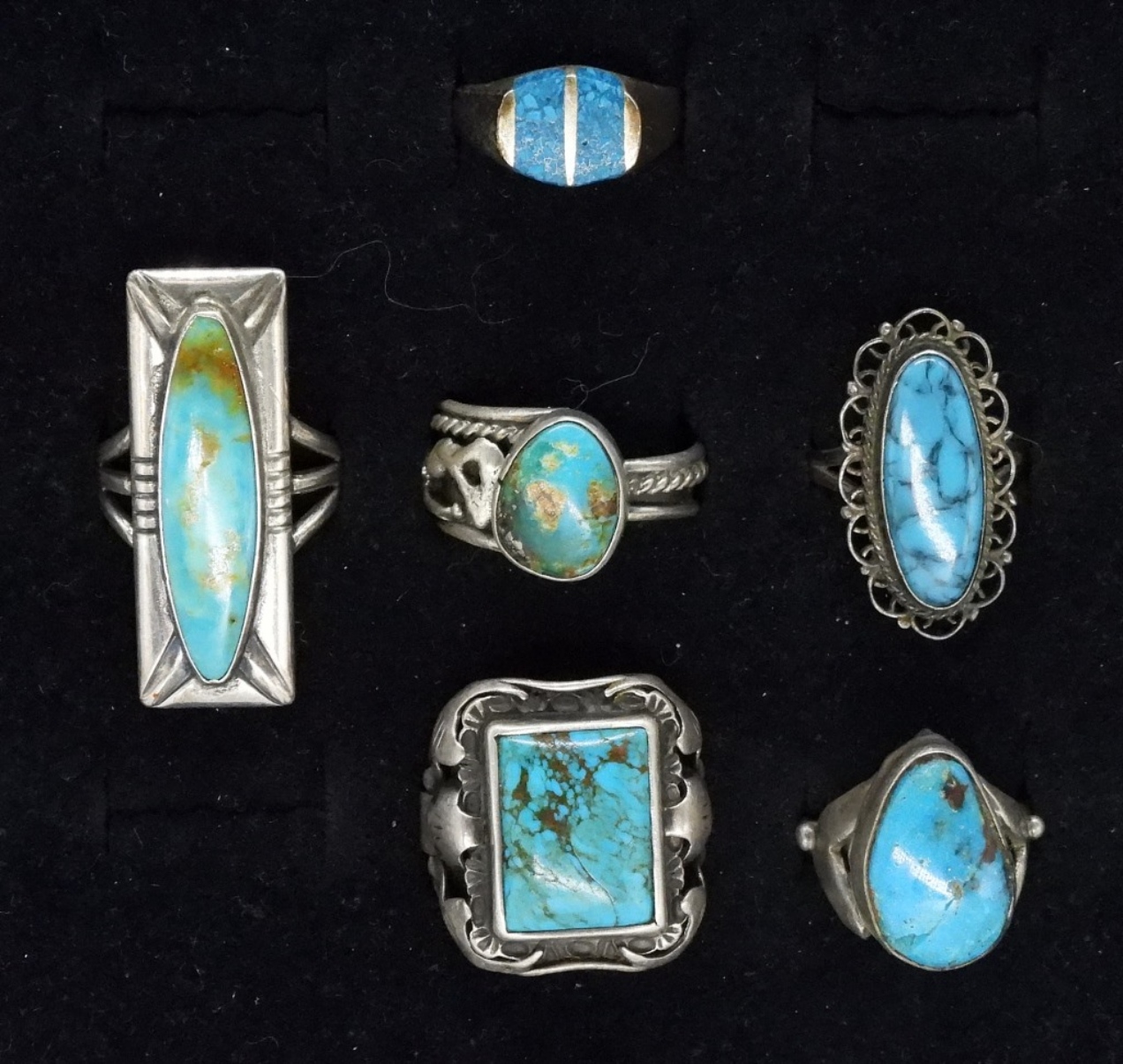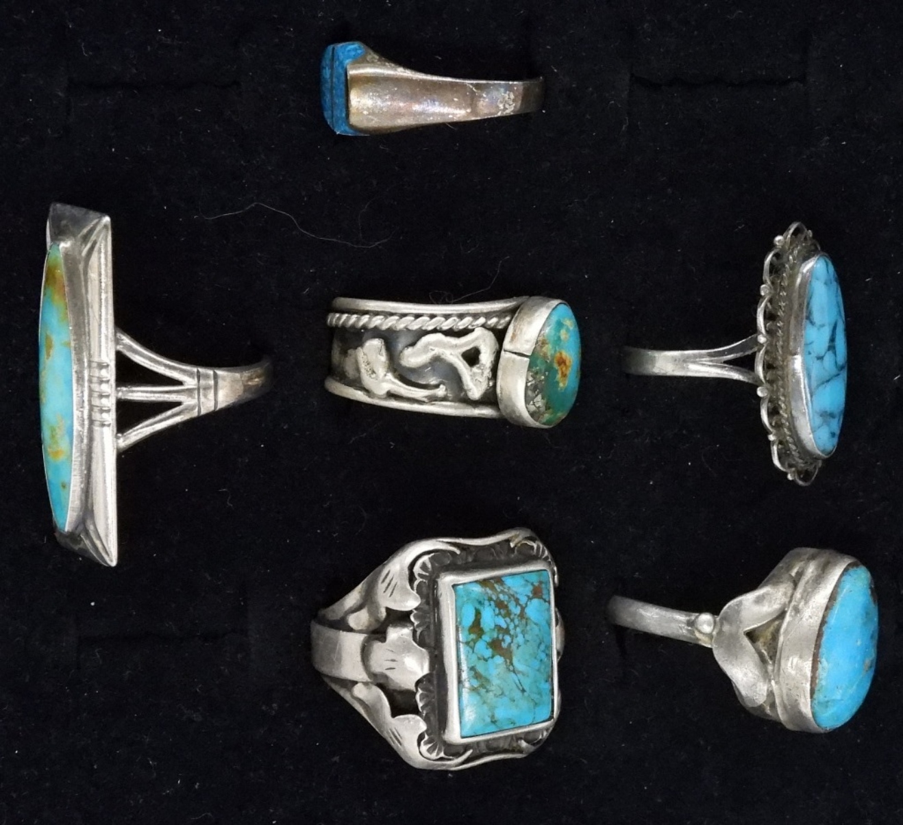 Six sterling rings with turquoise gemstones. Sizes 8-10 (29 dwt)