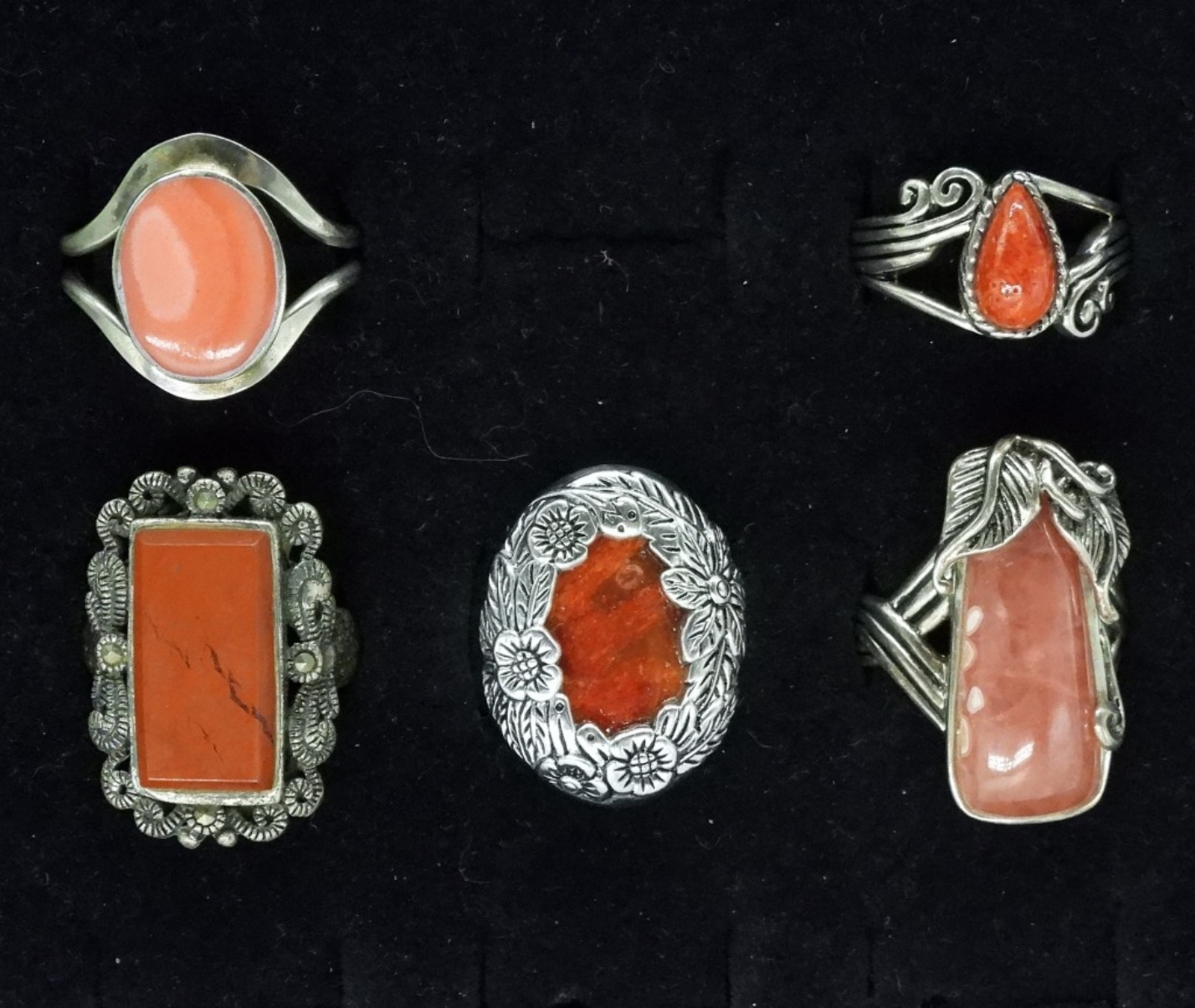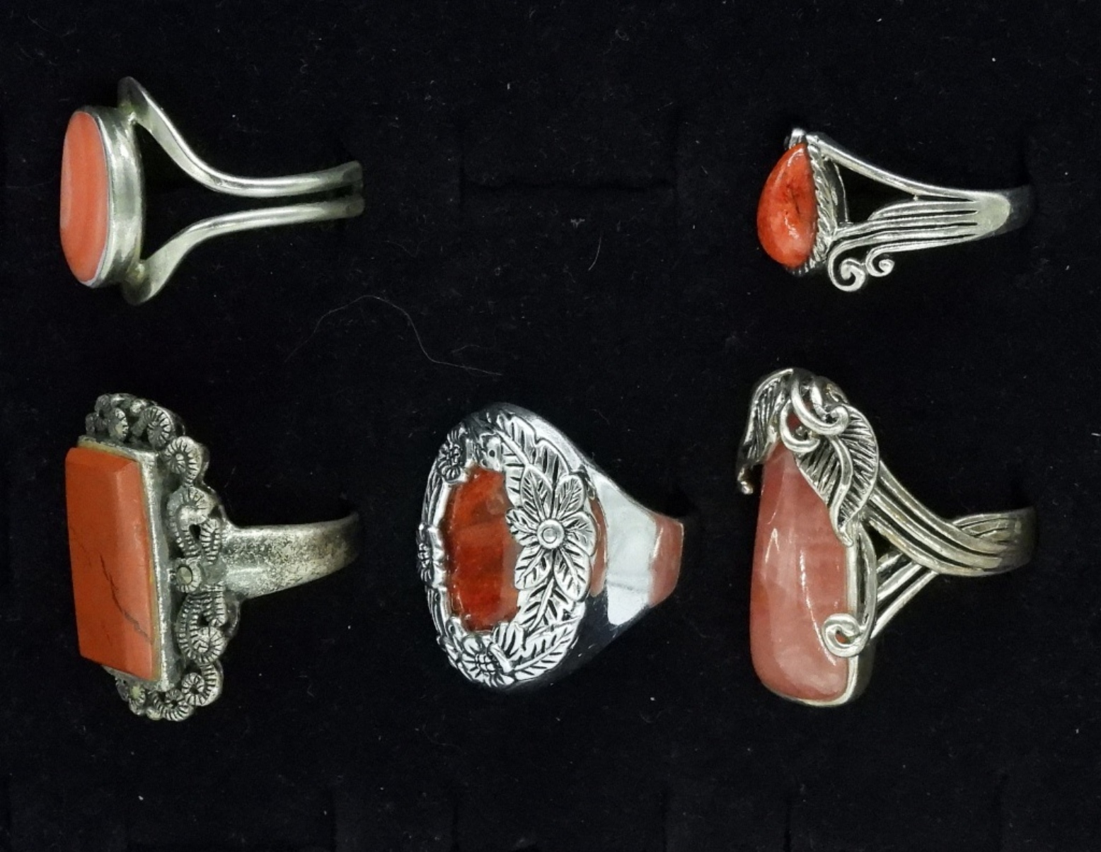 Five sterling rings with red and pink gemstones. Unidentified. Sizes 7, 9, 11 (25 dwt)