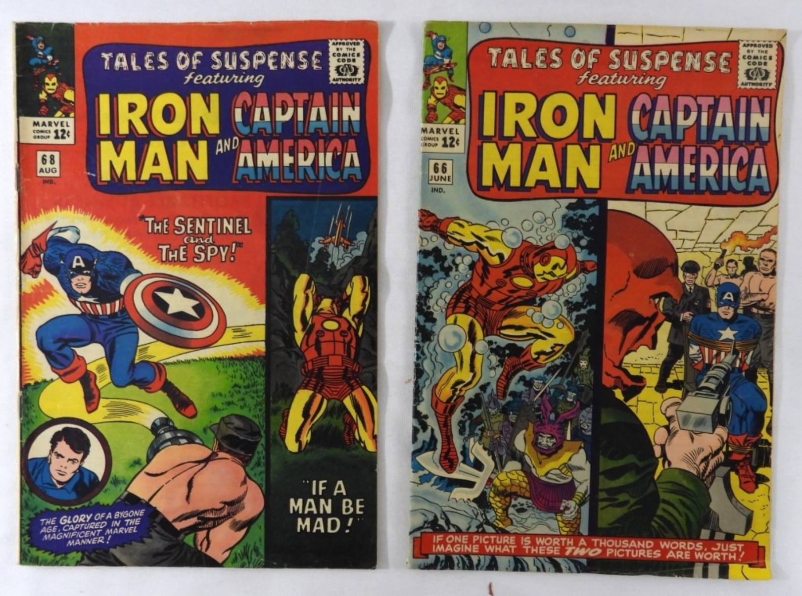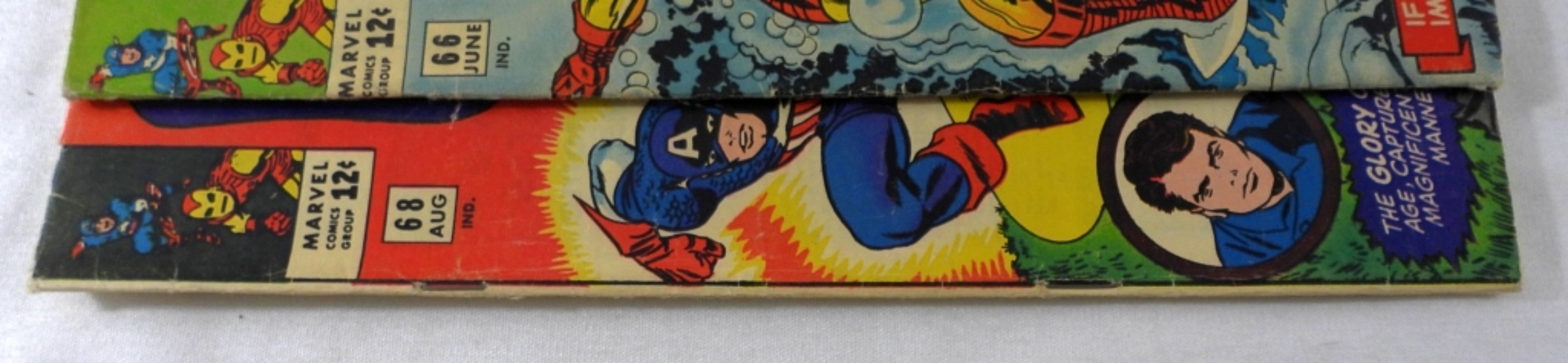 Featuring Iron Man and Captain America, #66 “If I Fail, A World Is Lost”, #68 ” The Sentinel and The Spy!”. Both 12-cent copies. Both in Good condition (has crease and rounded corners)