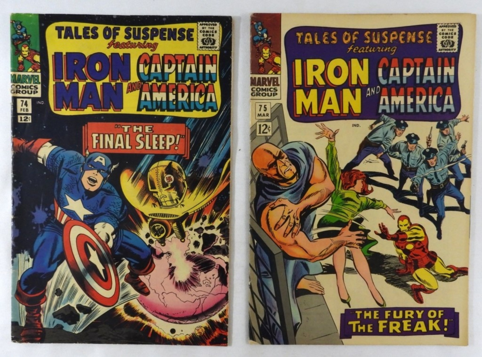 Featuring Iron Man and Captain America. #74 “The Final Sleep!”, # 75 “The Fury Of The Freak!”. Both are in good condition (creases around the spine and corners), 12-cent issues