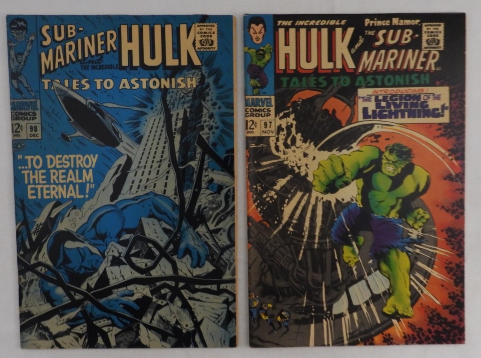 Sub-Mariner & The Incredible Hulk. Both 12-cent issues. Both in G/VG condition. Approved by the Comics Code Authority