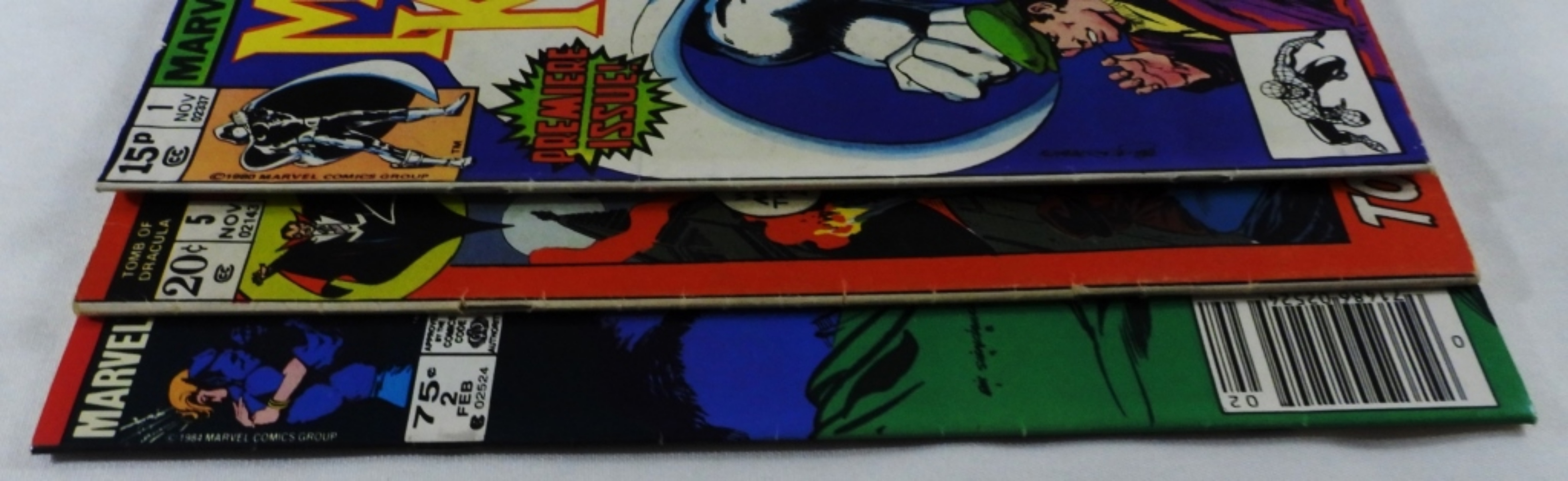 Moon Knight 198 #1, The Tomb of Dracula 1972 #5, and Beauty & The Beast 1985 #2, conditions vary