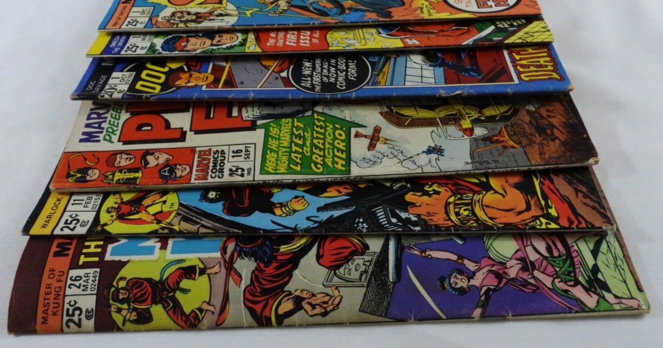The Son Of Satan #1 1975, Omega The Unknown #1 1975, Savage The Man of Bronze #1 1972, Phantom Eagle #16 1968 reprint, Warlock #11 1975, and The Hands of Shang-Chi, Master of Kung Fu #26 1975, conditions vary