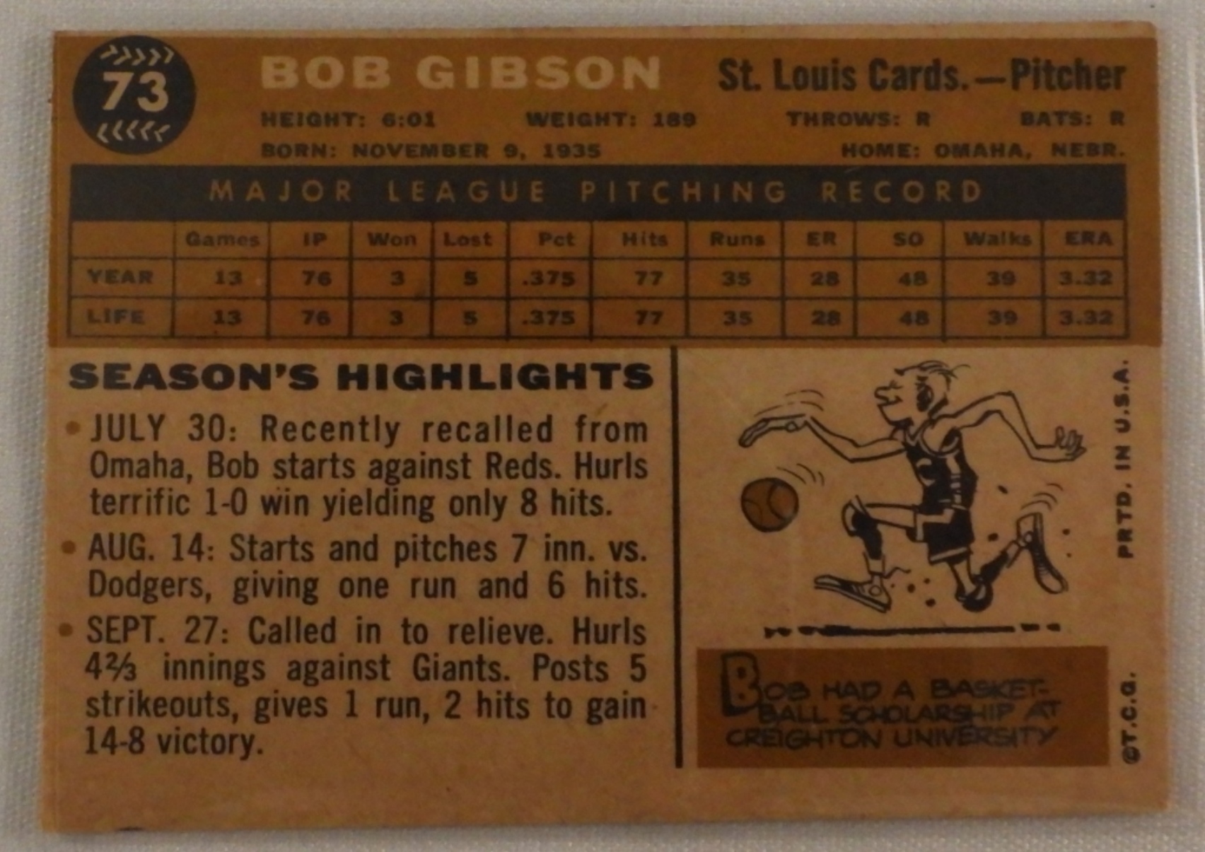 1960 Bob Gibson Topps # 73. In G-VG condition.
