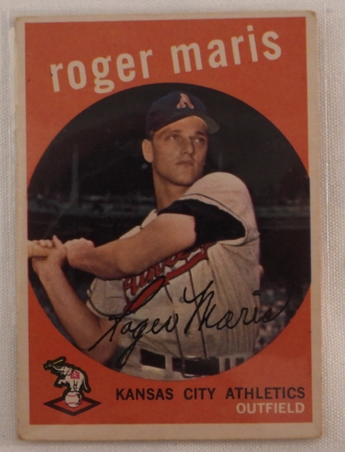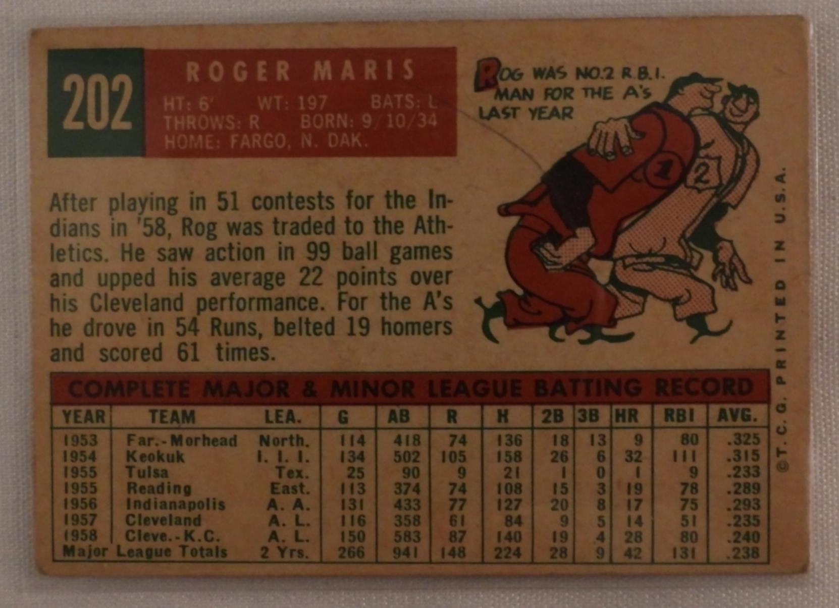 1959 Roger Maris Topps #202. In good condition, does show some wear. There is a pen mark on the back of the card.