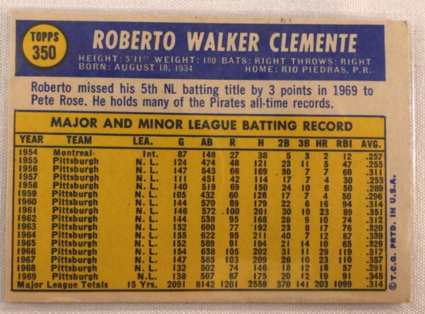 1970 Roberto Clemente Topps # 350. In G-VG condition.