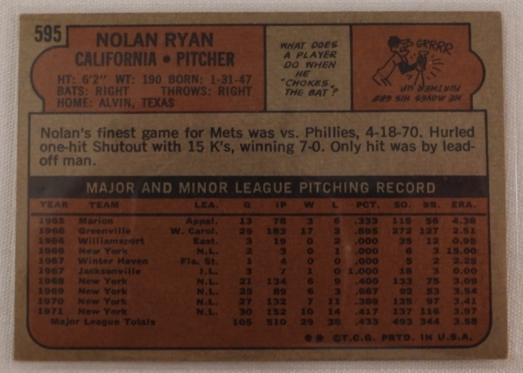 1972 Nolan Ryan Topps # 595. In VG condition.