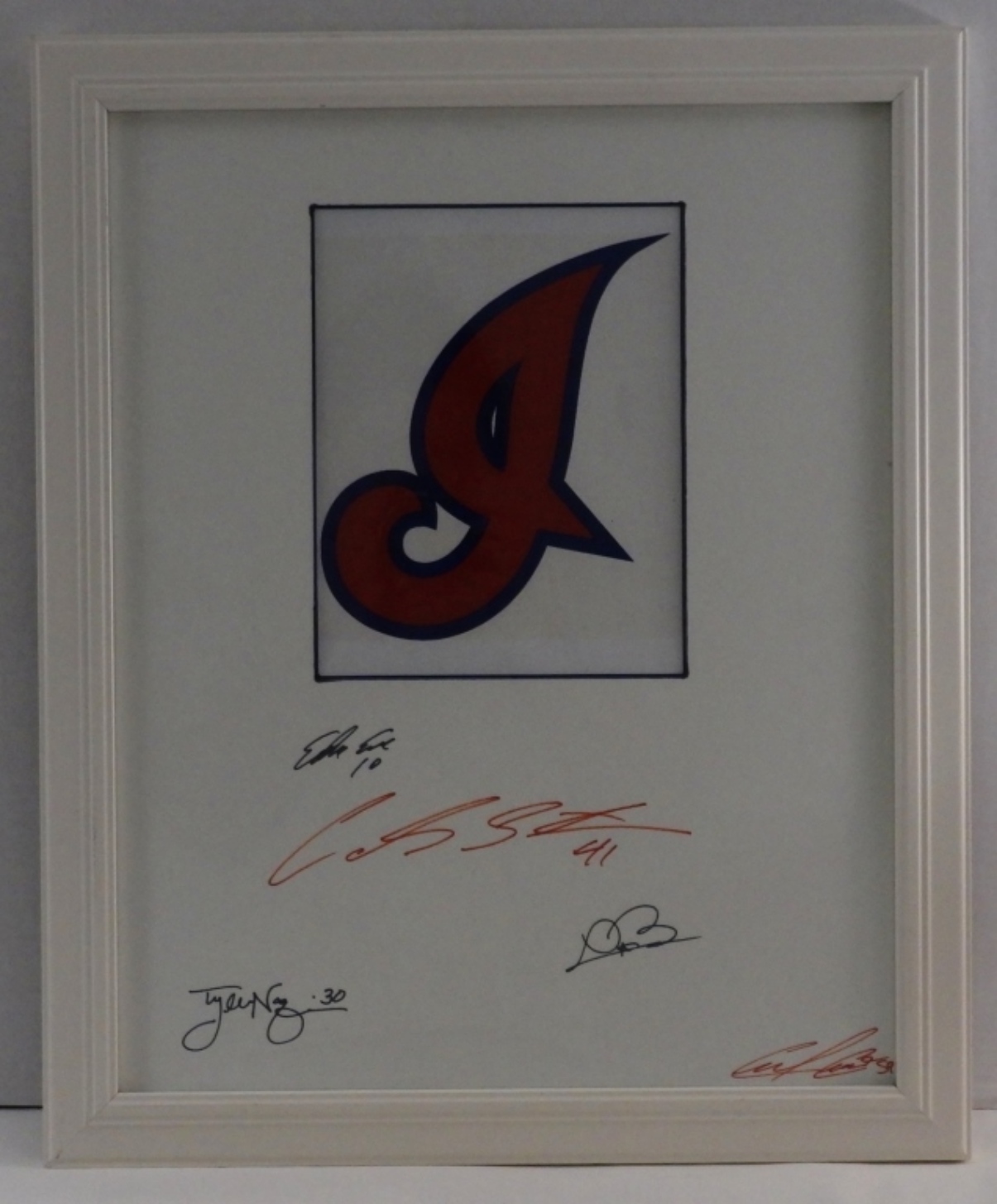 NO COA Signed by five players, three 5X7s (one is wrinkled) come with this set of players who are signing objects. Tyler Naquin #30, Carlos Santana, and Carlos Carrasco. And one other that looks to be Jay Bruce;