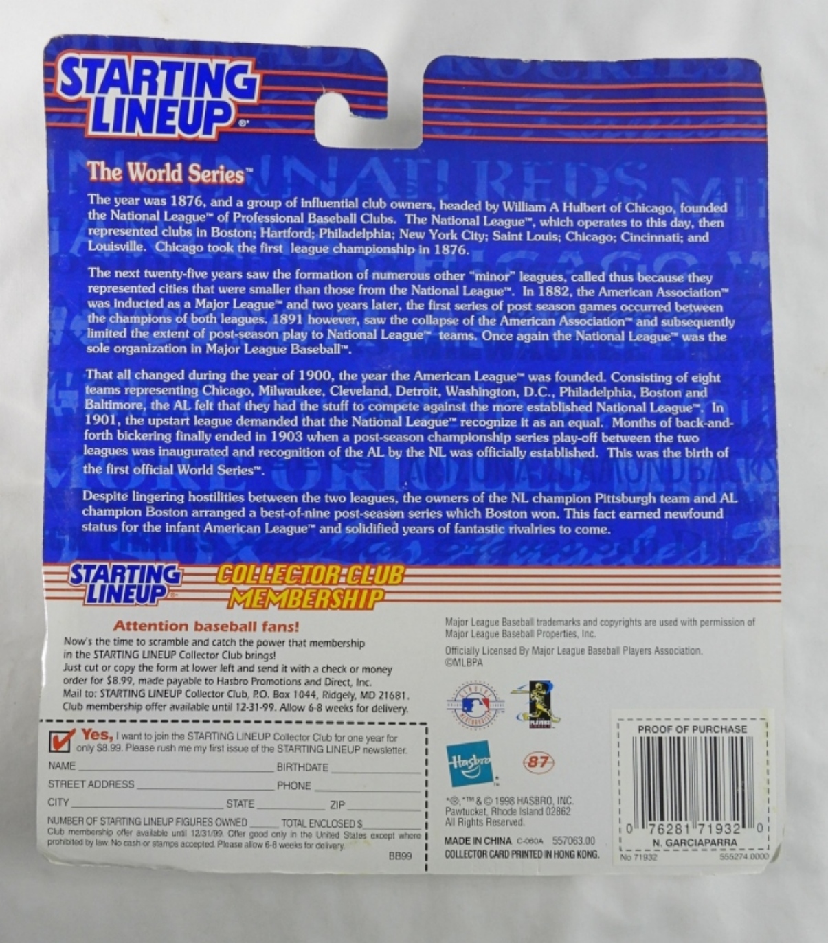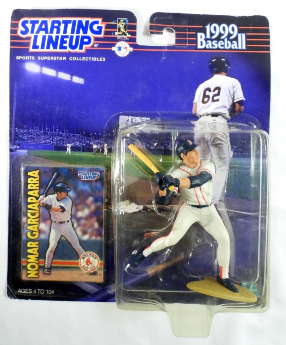 Still in its package, the box has normal wear from the years, 1999 Baseball Edition, made by Kenner