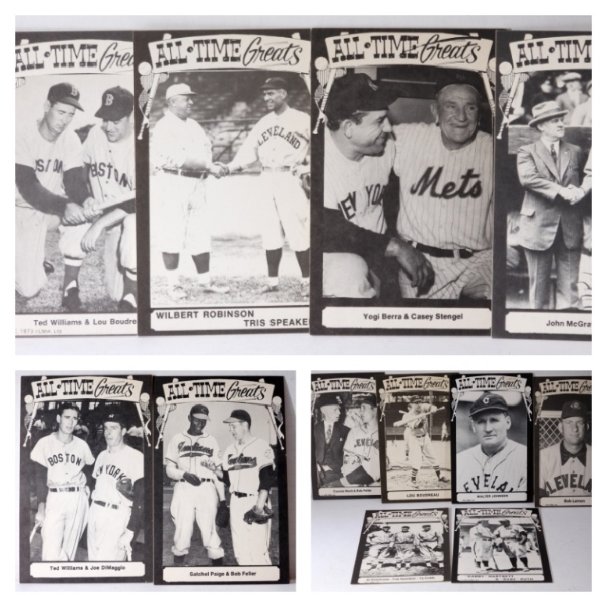 Ted Williams & Joe DiMaggio/ Satchel Paige & Bob Feller, Al Simmons, Tris Speaker, Ty Cobb/ “Gabby” Hartnett & “Babe” Ruth, Bob Lemon, Walter Johnson, Lou Boudreau, Connie Mack. Plus more
