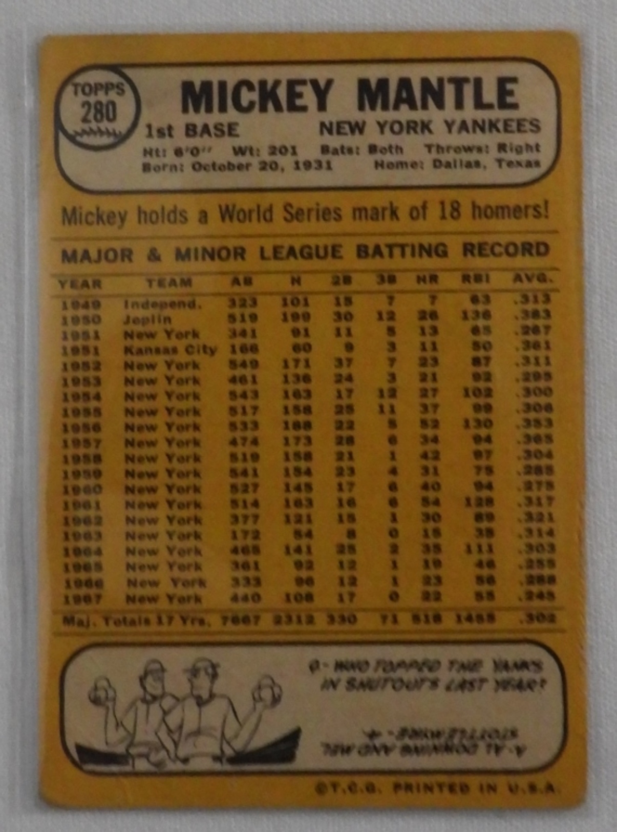Mickey Mantle TOPPS #280, 1968, some rounding on the corners, crease on the bottom right, vg