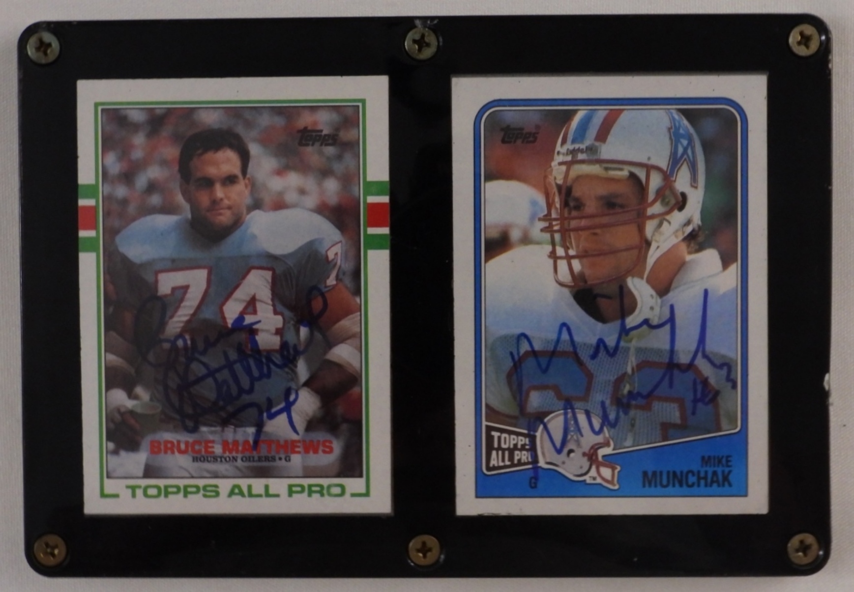 Signed Football cards, Bruce Matthews and Mike Munchak, in a double plaque, with COA by H.L.T. & T. Sports