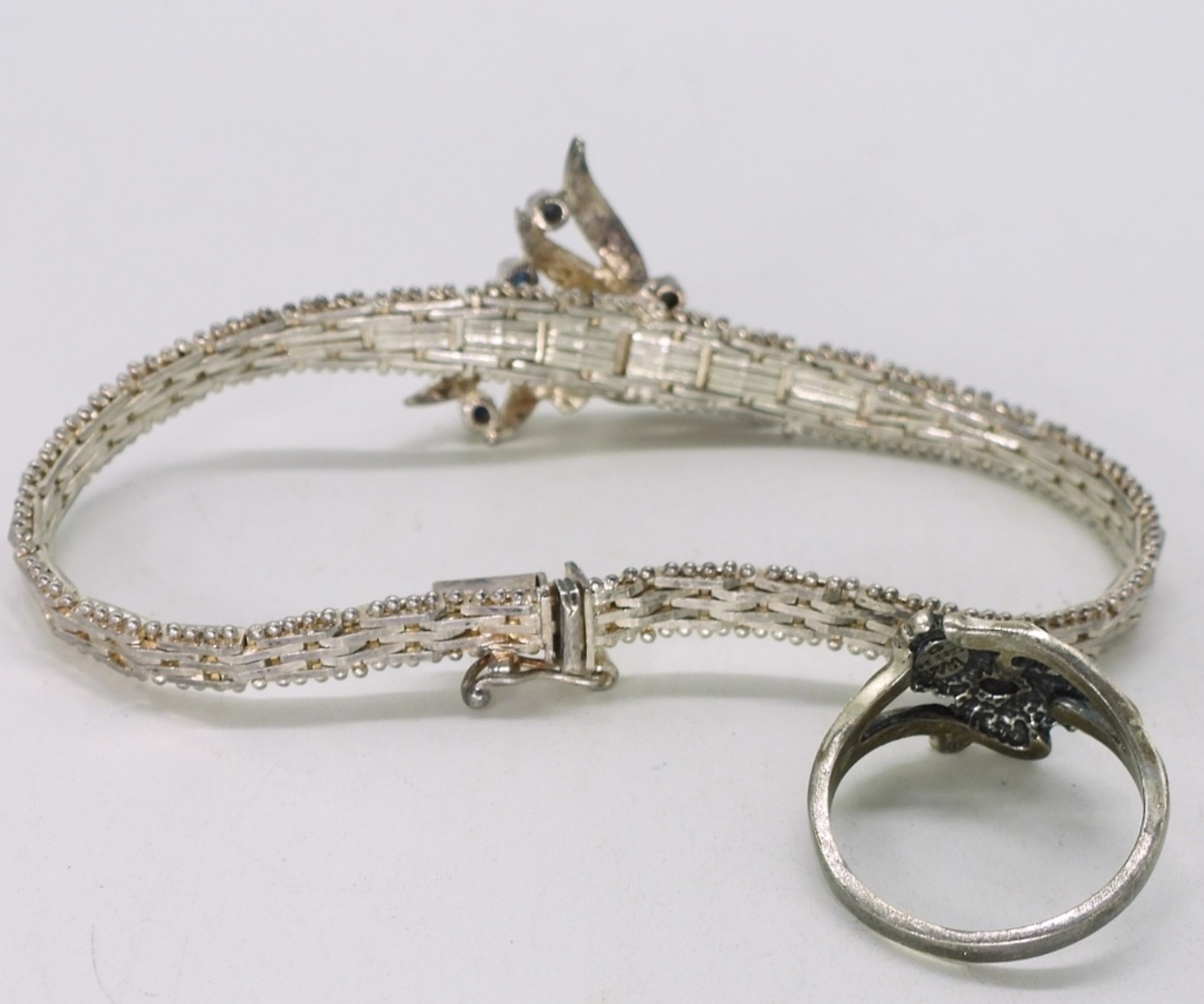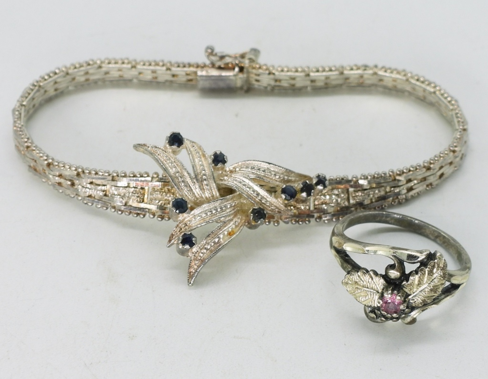 Italian sterling & sapphire spray mesh bracelet, 7.5″. Clasp works. Grapevine ring with ruby gemstone, size 7.5 (12.1 dwt)