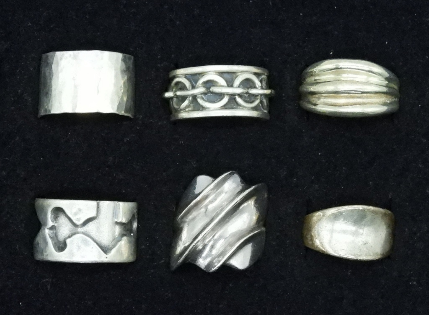 Six sterling rings, one “chain” Taxco ring (Taxco Mexico SMS) size 8. Other rings are size 6-9 (38.5 dwt)