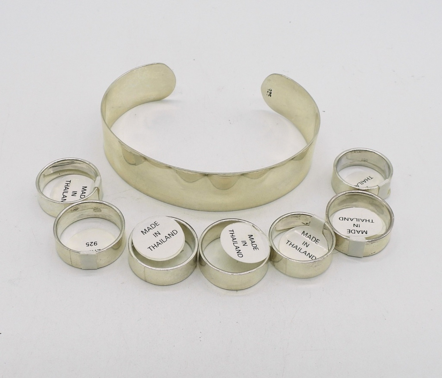 7 identical sterling bands, sizes 5-7 (new with tags). One sterling, plain cuff bracelet 7″. (31 dwt)